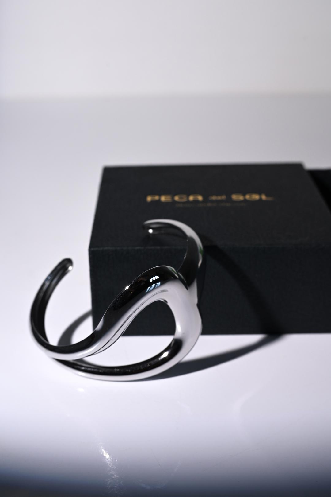 • cuff stříbrný pevný náramek z chirurgické oceli PECA del SOL zaujme umělecky pojatou siluetou, která je jako plynulý objekt vytvořený jedním tahem