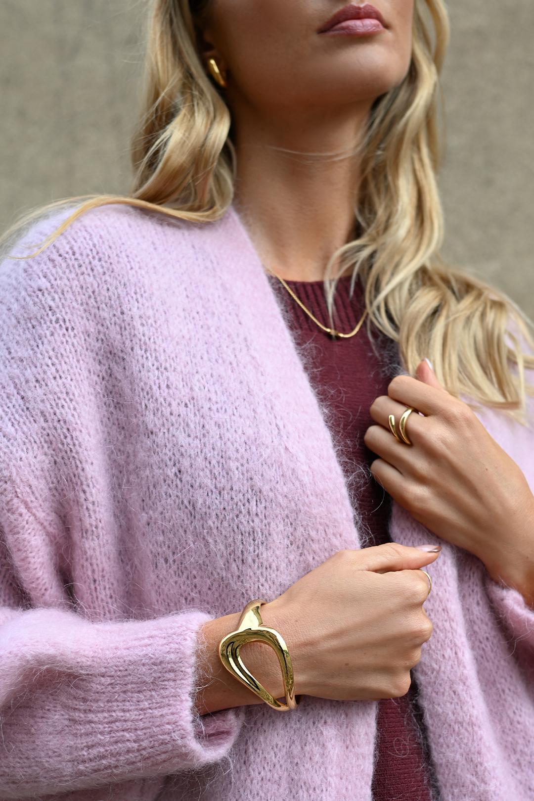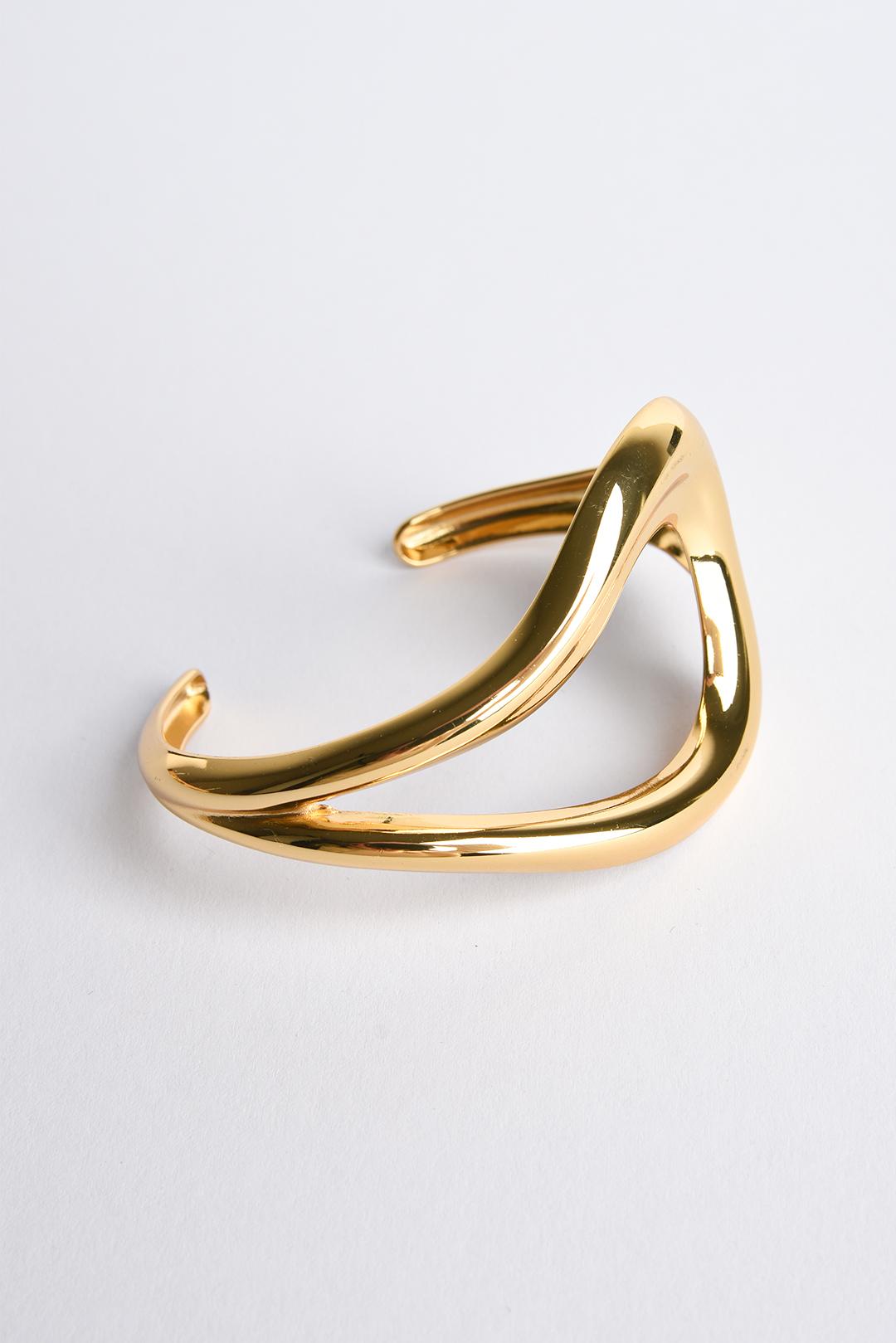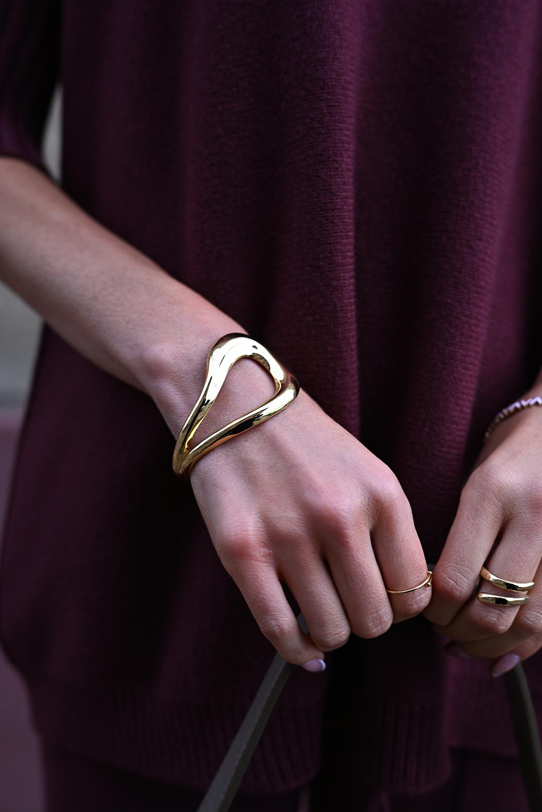 • výrazný zlatý pevný náramek od značky PECA del SOL s otevřeným cuff provedením pracuje s plynulou vlnitou linií, která na ruce vypadá sebevědomě a moderně