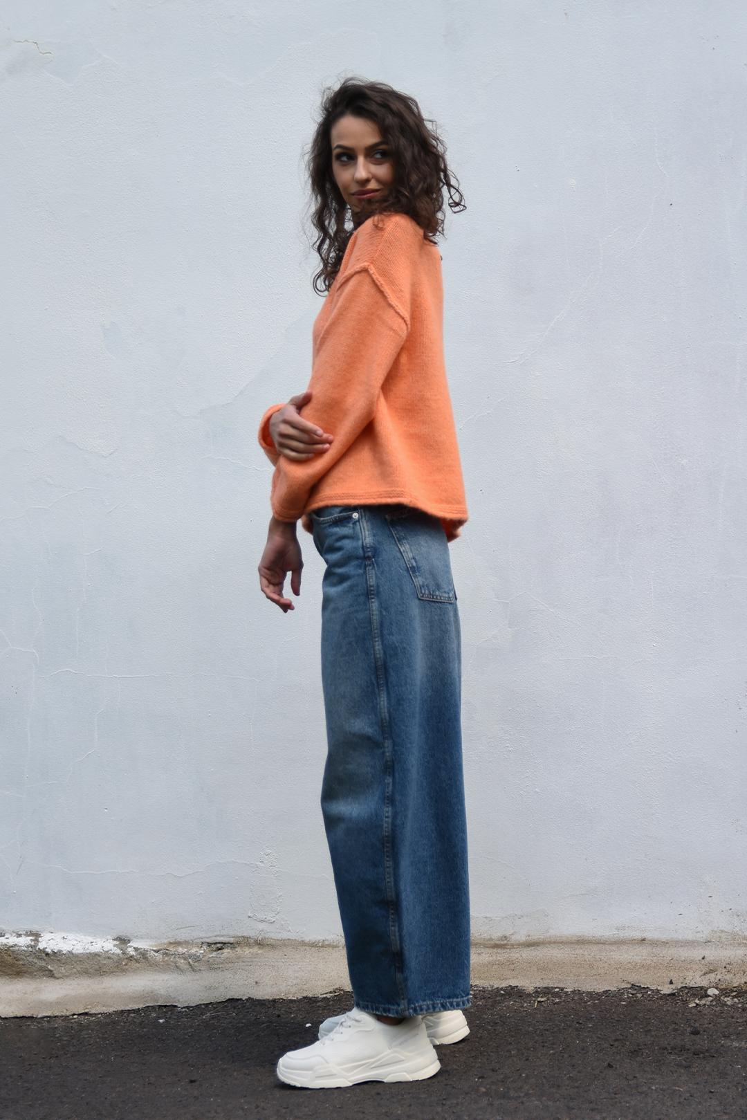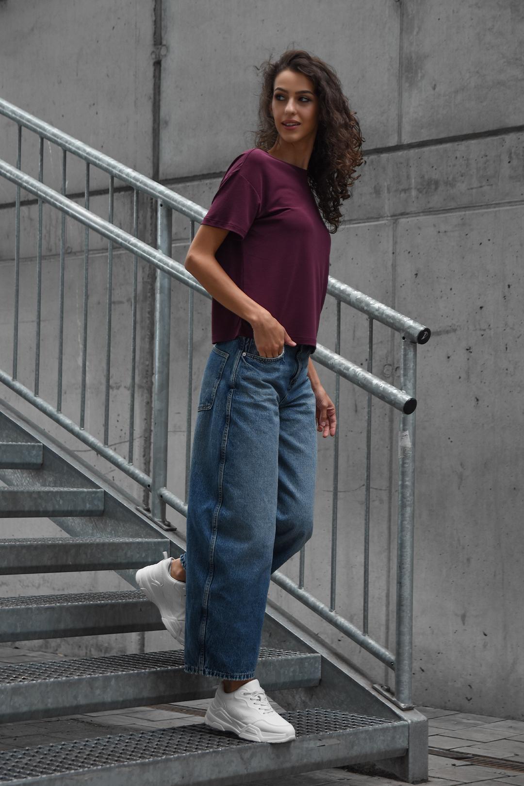 • modré barrel džíny s vysokým pasem a rovně střiženou, mírně klenutou nohavicí