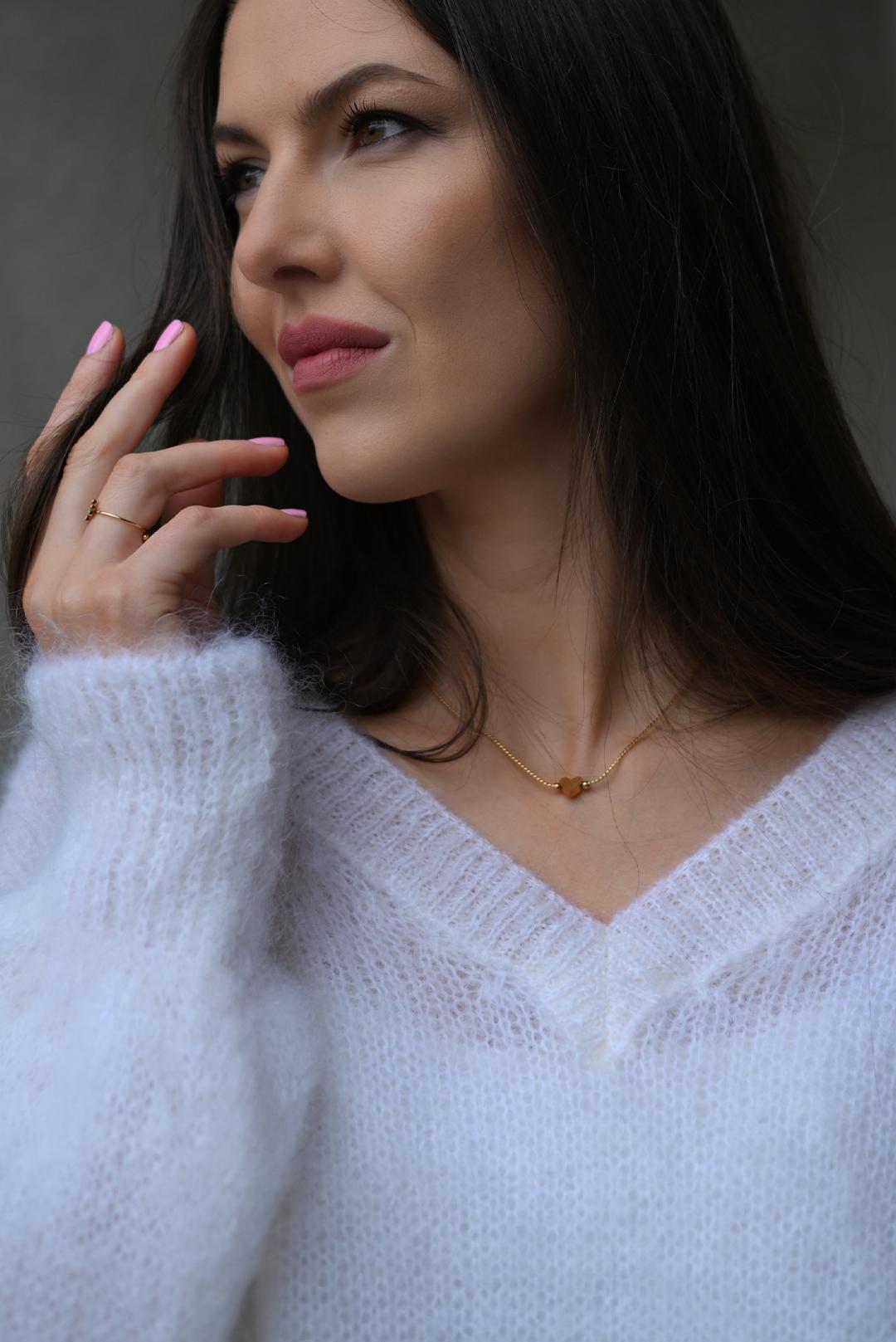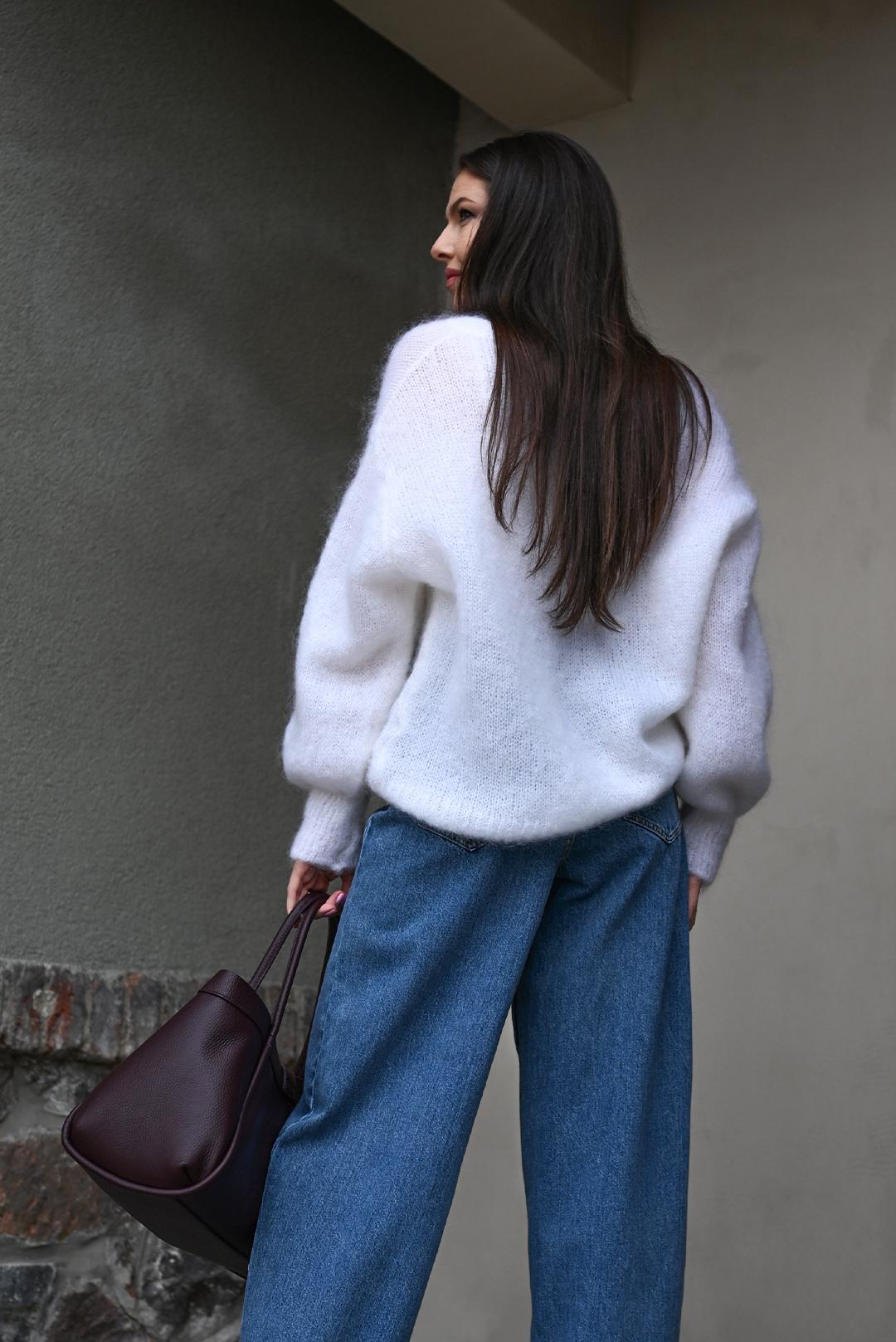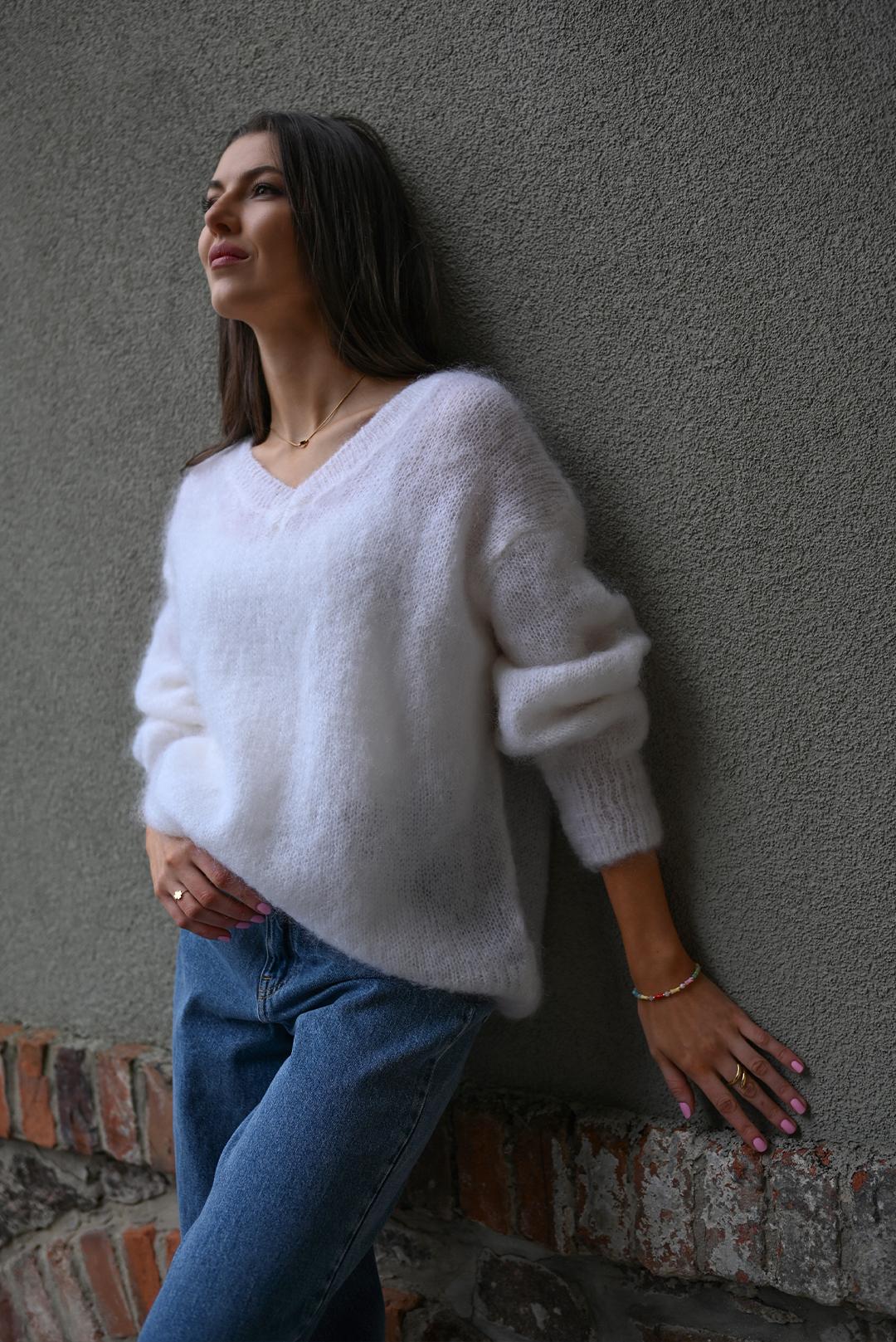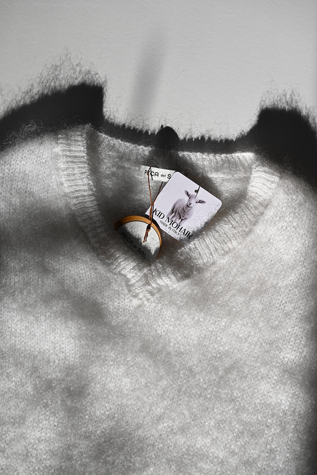 • bílý mohérový svetr s výstřihem do V oblíbené značky PECA del SOL = jemnost, která Vás pohladí už při prvním doteku