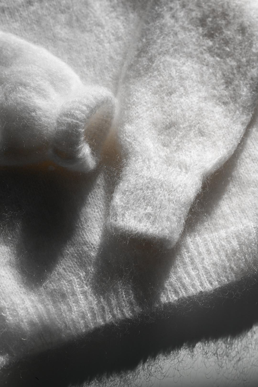 • výjimečně hebký úplet z 81 % kid mohéru, 17 % polyamidu a 2 % elastanu – hřeje, aniž by působil těžce, a zůstává lehký jako pírko