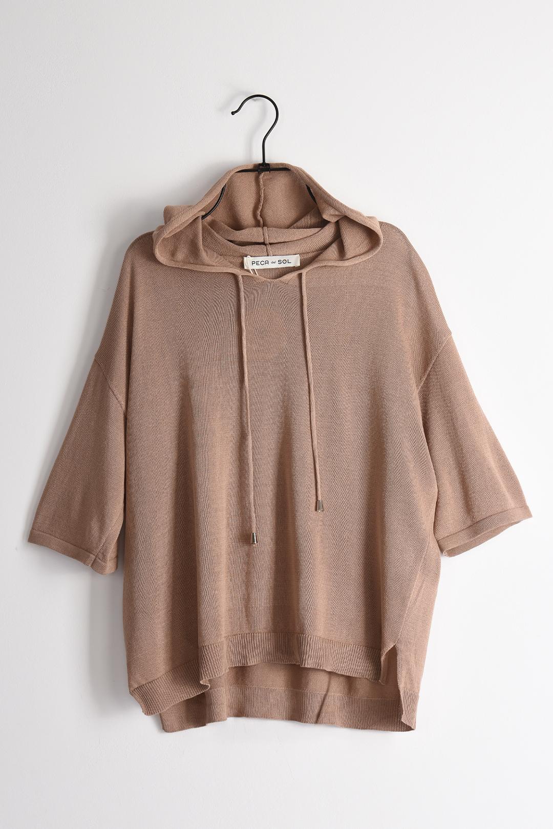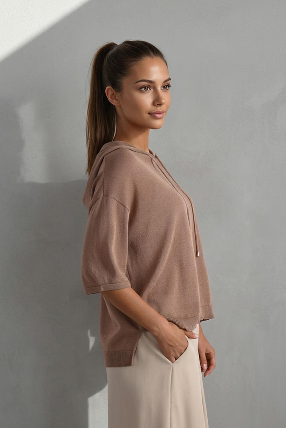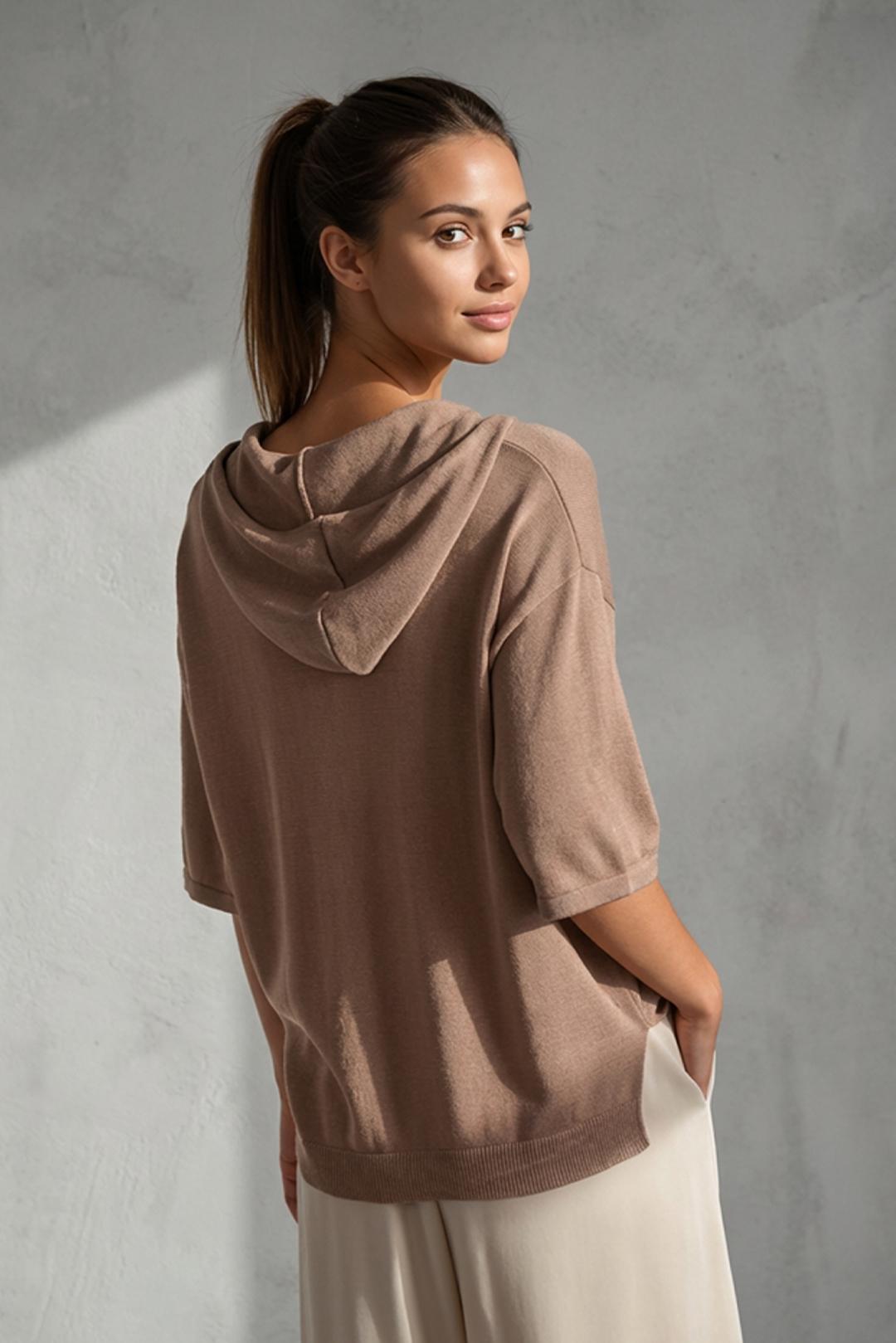 • lehké úpletové tričko s kapucí dámské oblíbené značky PECA del SOL v tlumeném světlě hnědém odstínu přináší do outfitu jemnou, uvolněnou eleganci