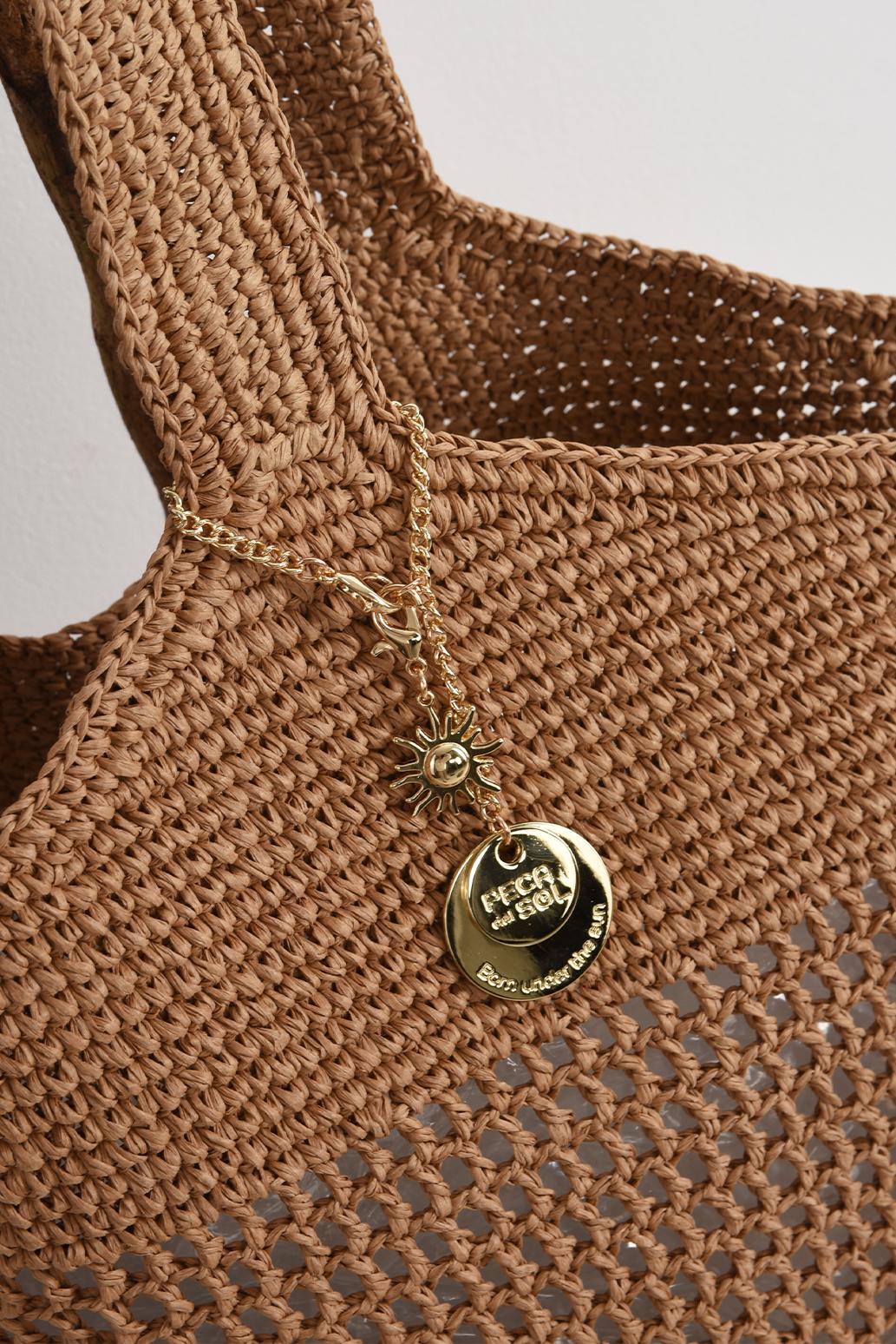 • zlatý signature charm přívěsek se sluncem a logem značky PECA del SOL funguje jako drobný šperk, který jemně oživí celý outfit