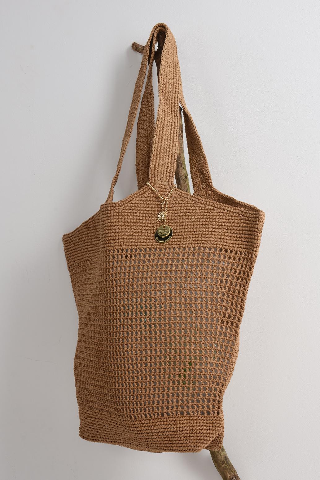 • dámská velká hnědá slaměná kabelka tote bag PECA del SOL v karamelově hnědém tónu zaujme vzdušnou strukturou, která nechává obsah nepatrně prosvítat