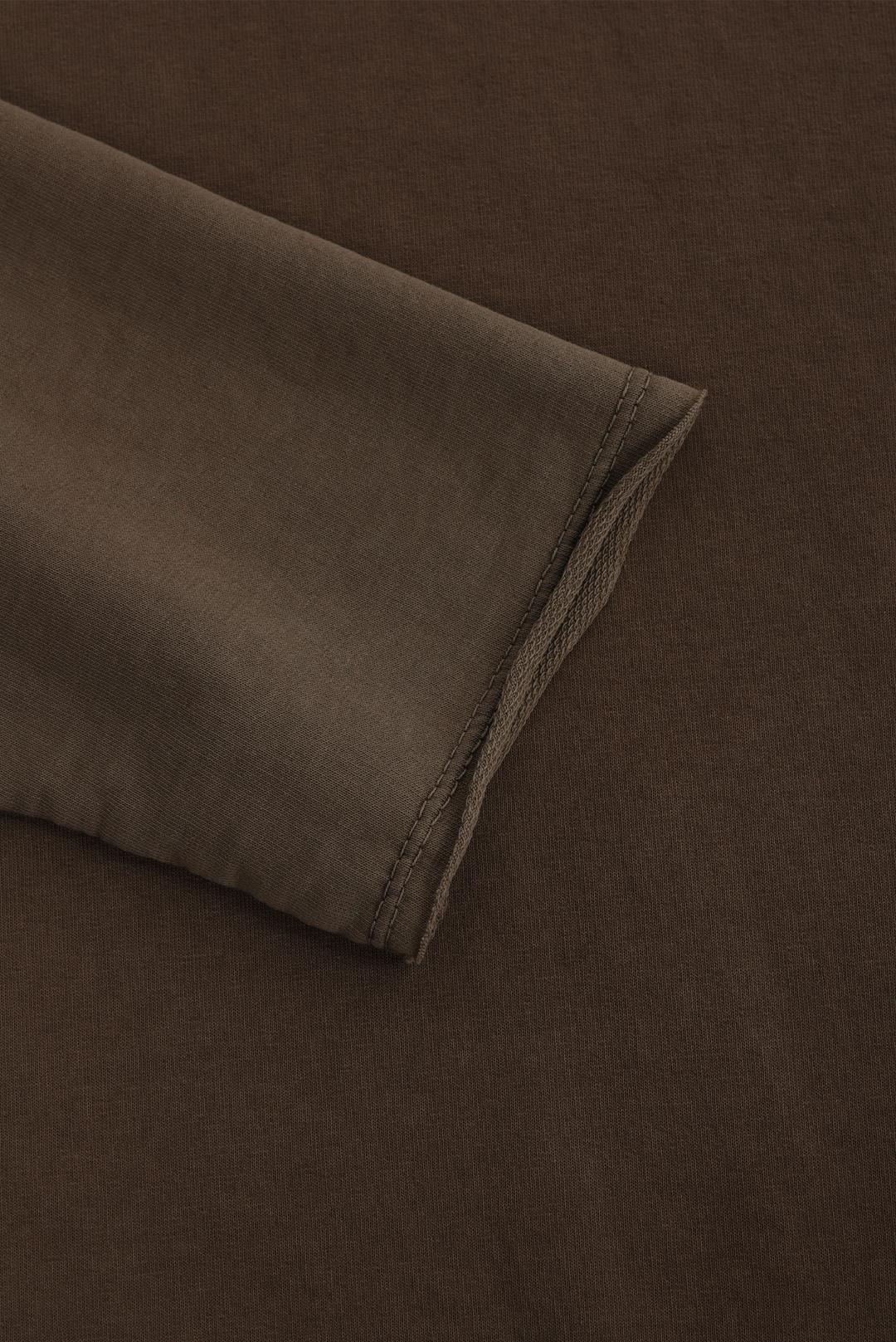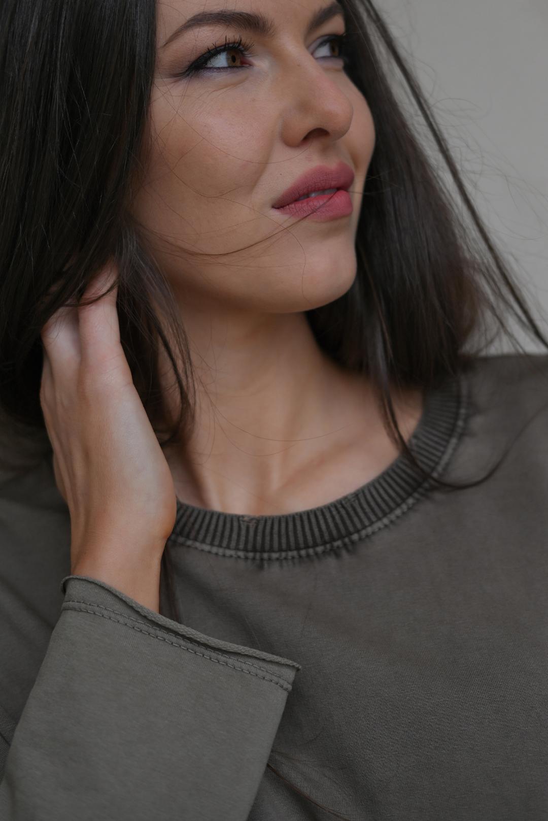 • kulatý výstřih s jemným žebrovaným lemem a viditelným prošitím je zajímavým detailem a dodává modelu lehce sportovní nádech