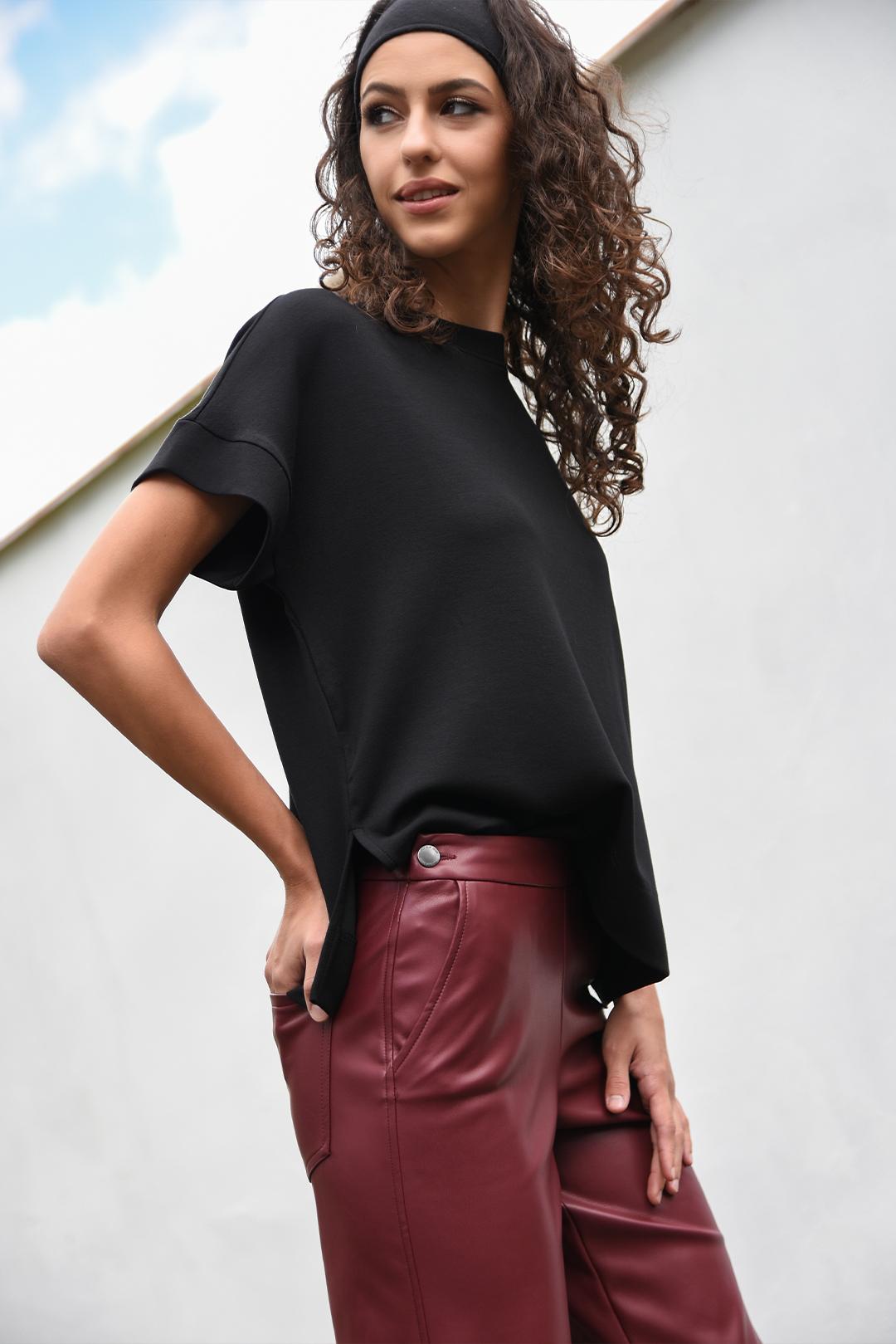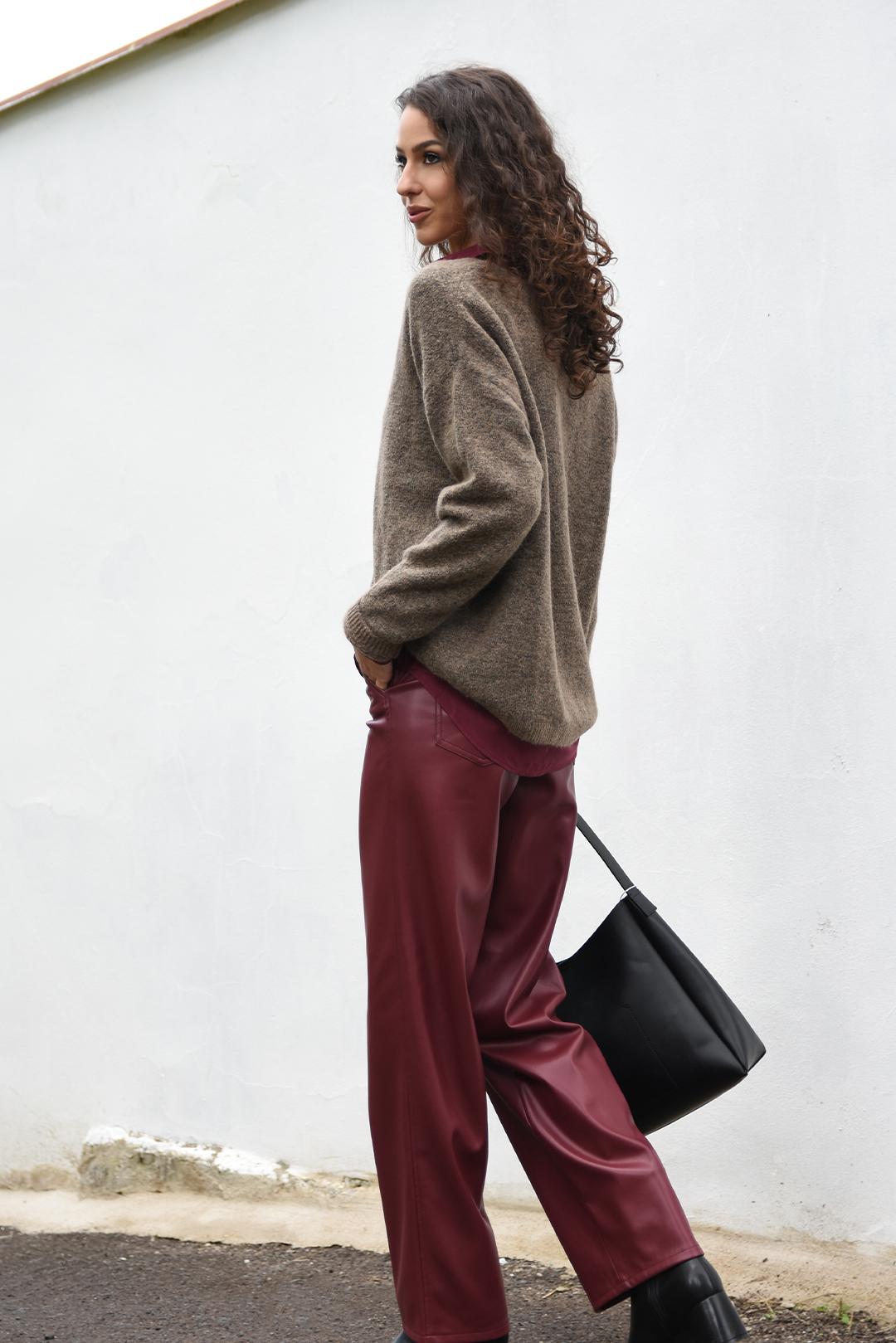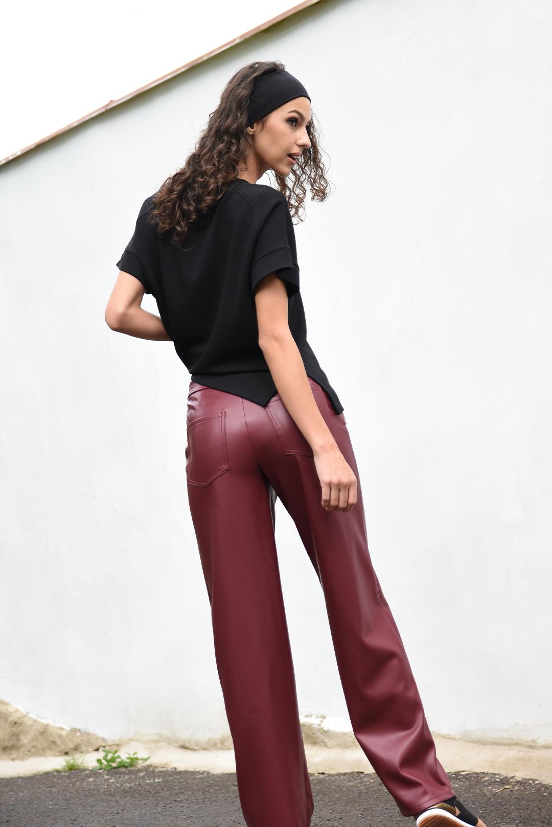 • bordó kalhoty z eko kůže dodají outfitu výrazný a elegantní nádech