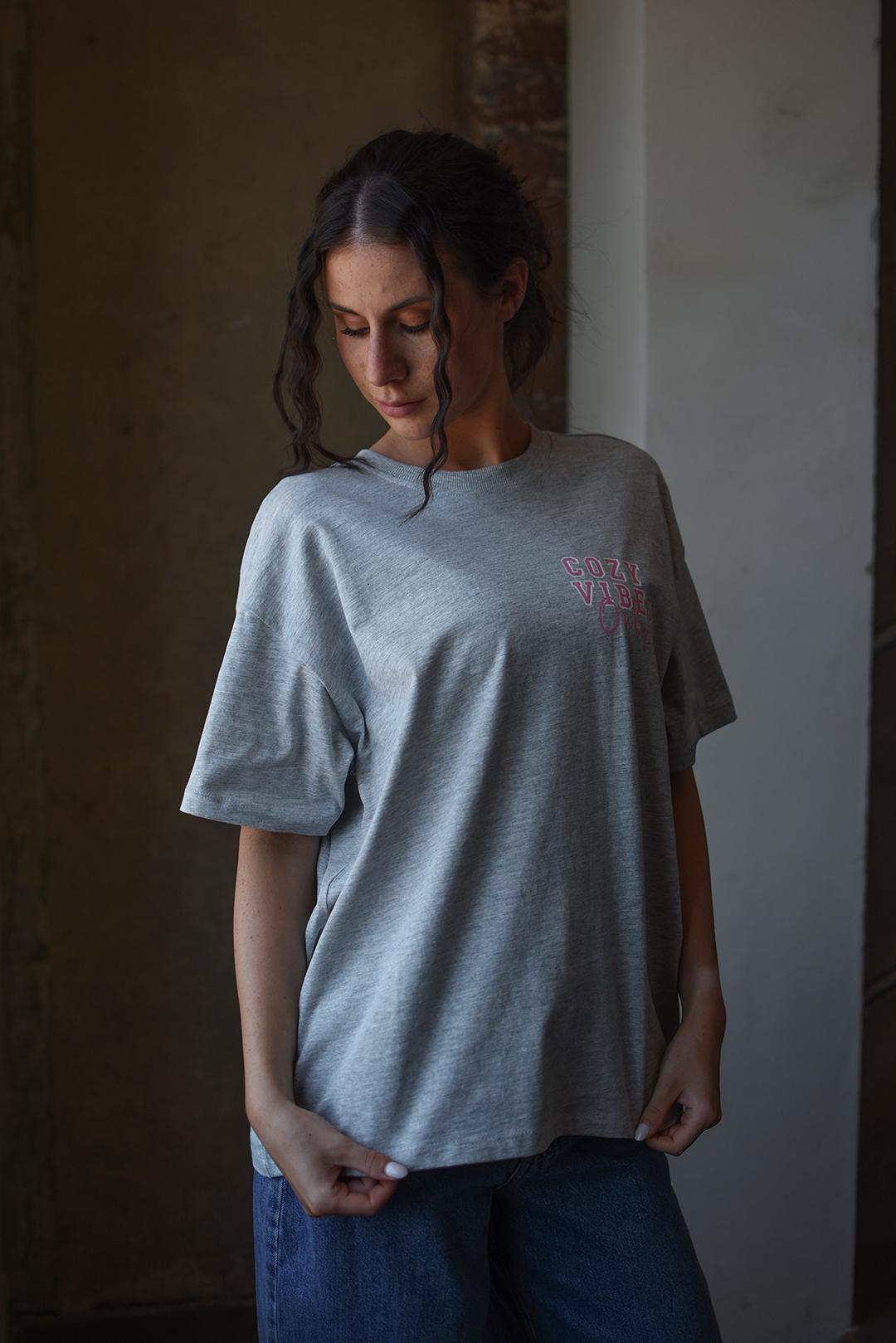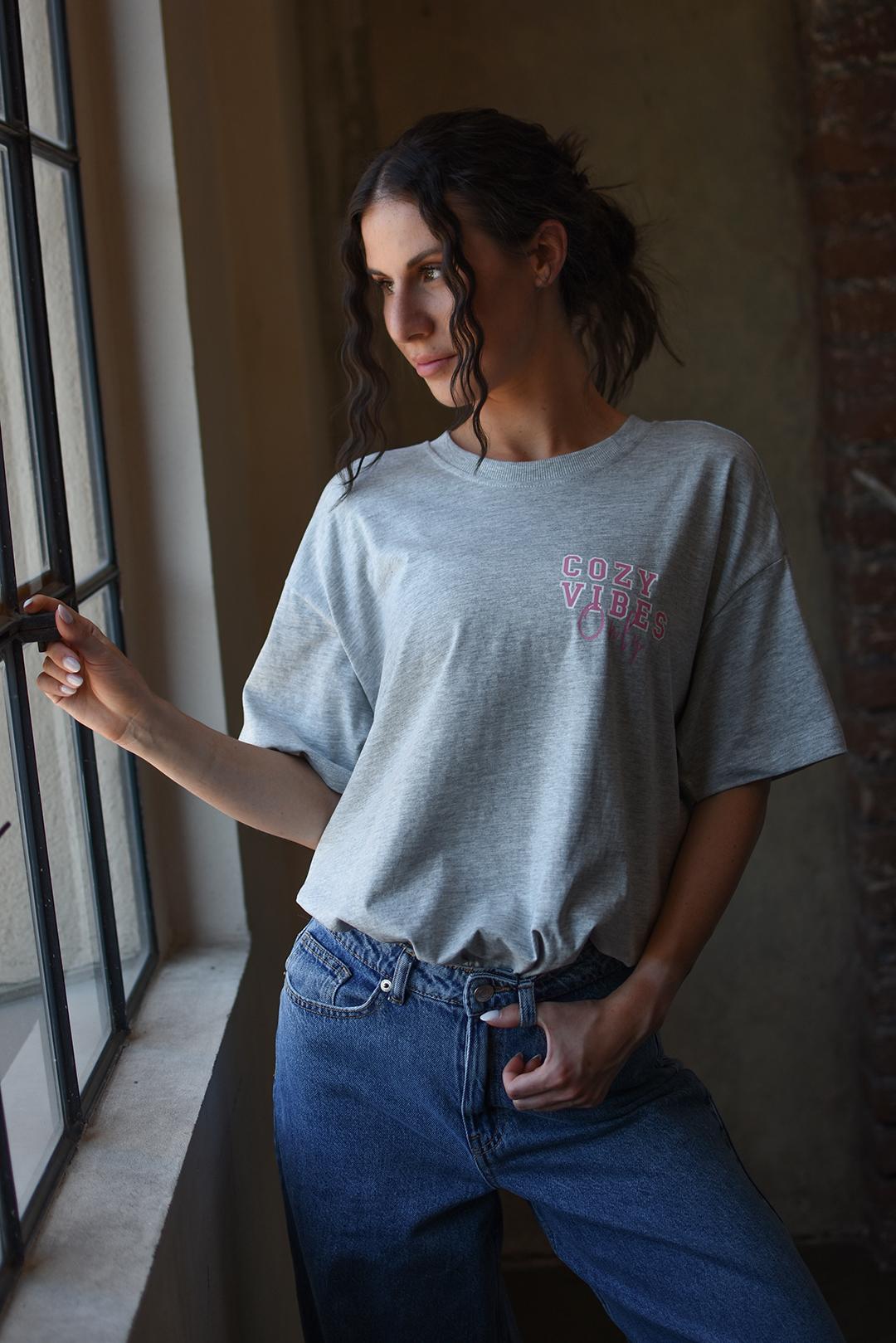 • dámské tričko s krátkým rukávem s růžovým potiskem na prsou – Cozy Vibes Only -