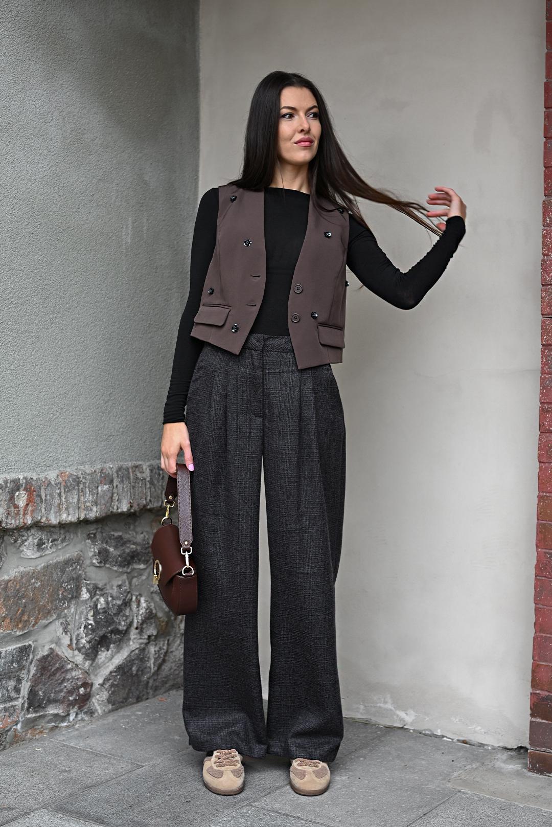 • elegantní vesta dámská s cool ozdobami skandinávské značky Pieces v teplém hnědém odstínu kombinuje klasický střih s jemným nádechem hravosti