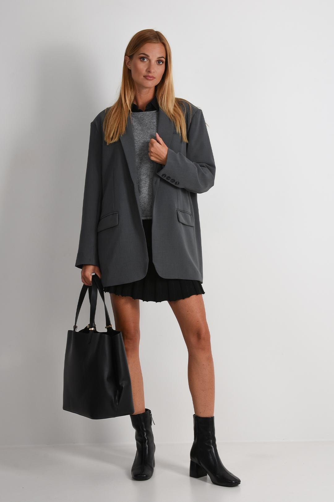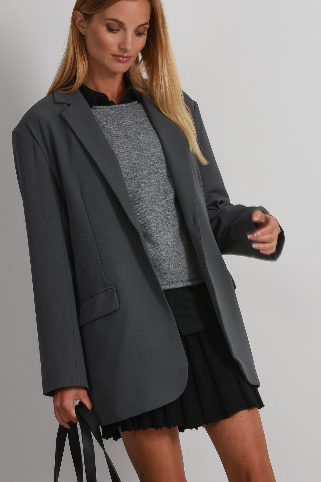 • oversize sako dámské v tmavě šedé barvě, které si bere inspiraci z pánského šatníku, ale dodává mu ženský twist
