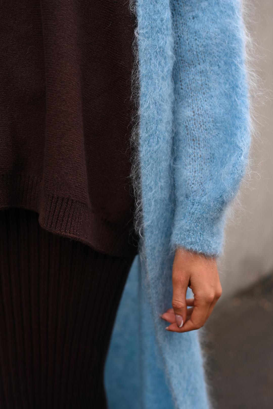 NEBESKY MODRÝ DLOUHÝ TEPLÝ KARDIGAN Z MOHÉRU