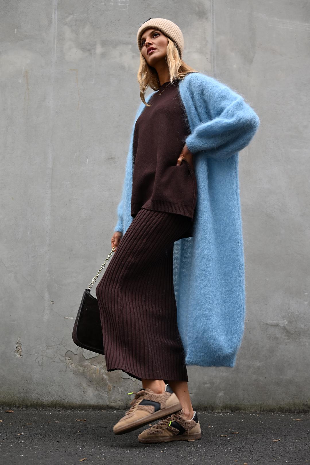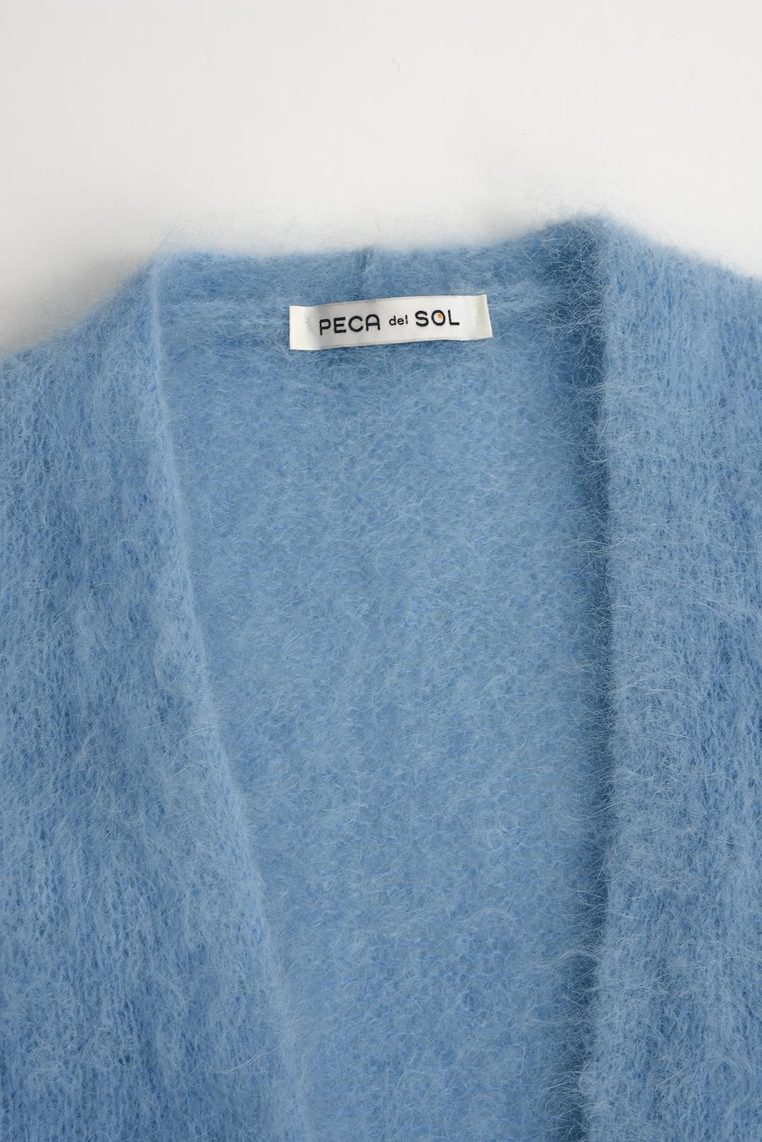 • vzdušný dlouhý teplý kardigan PECA del SOL v odstínu světle modré přináší do zimních dnů dotek jemnosti a hravé elegance