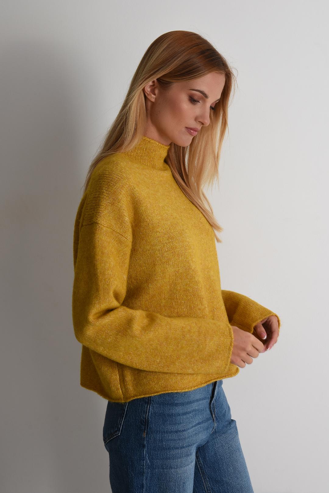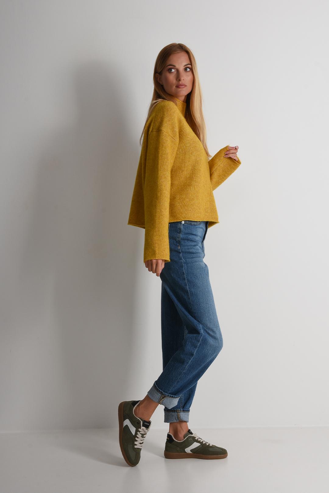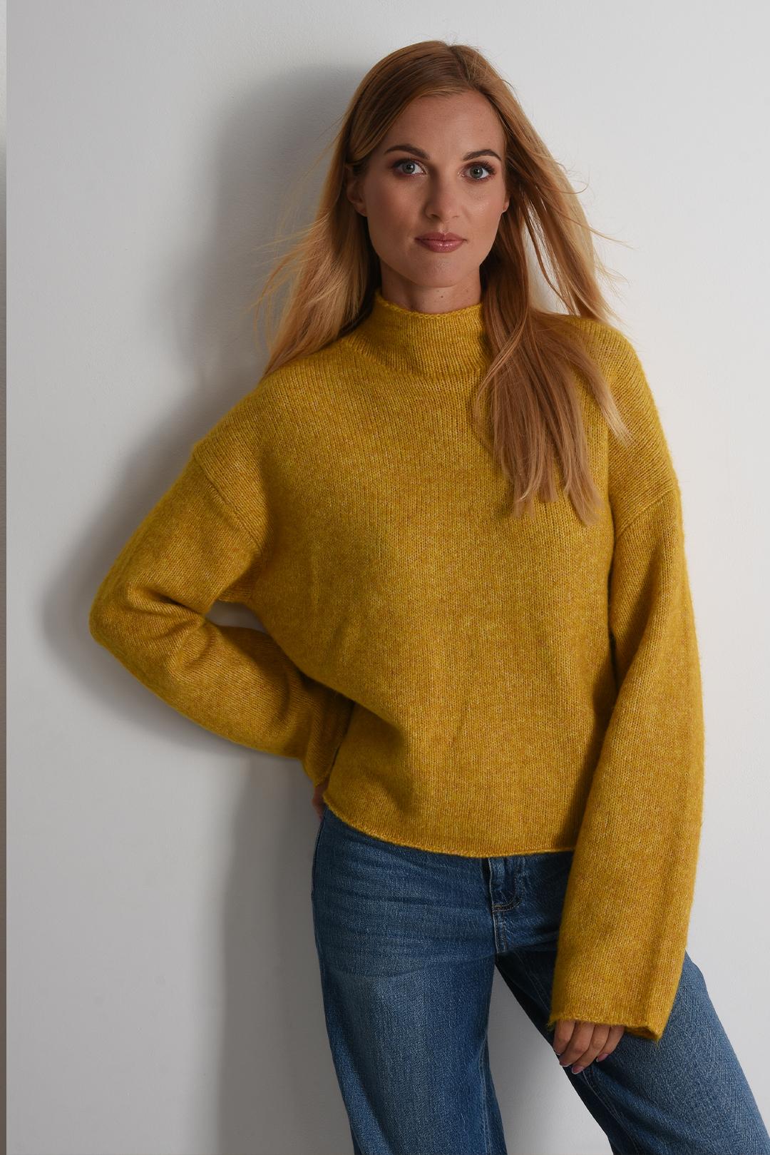 • krátký stojáček svetru jemně kopíruje linii krku a dodává hořčicovému svetru moderní, lehce chic look