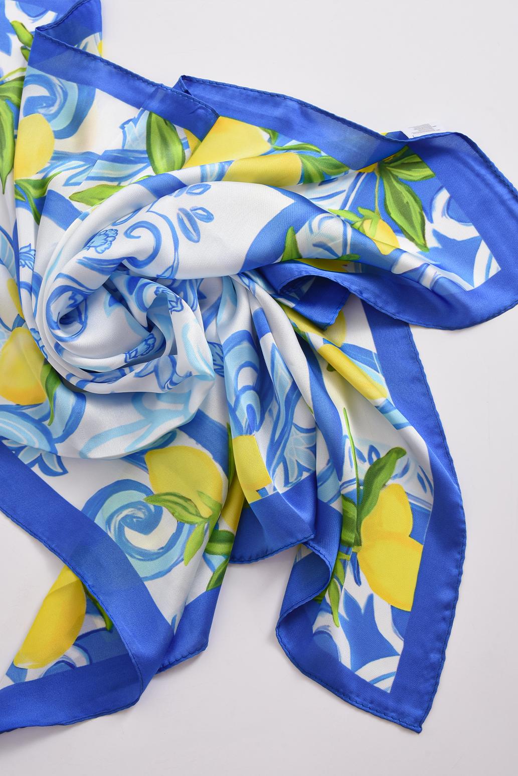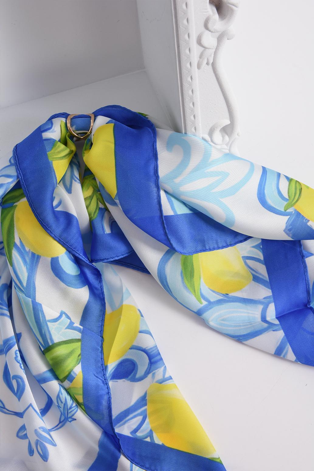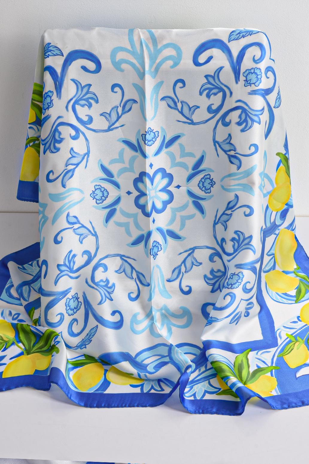 • dámský letní šátek s citróny PECA del SOL v bílo-modrém kontrastu s motivem citrónů a ornamentů odkazuje na letní energii a estetiku typickou pro italské pobřežní oblasti Amalfi