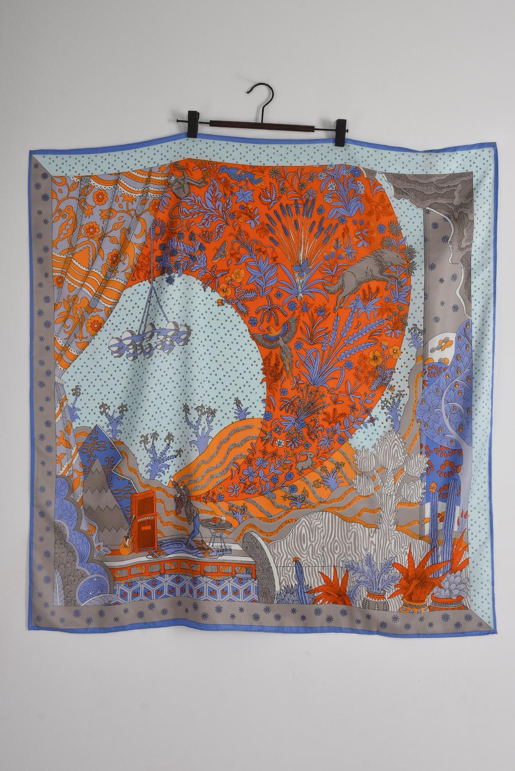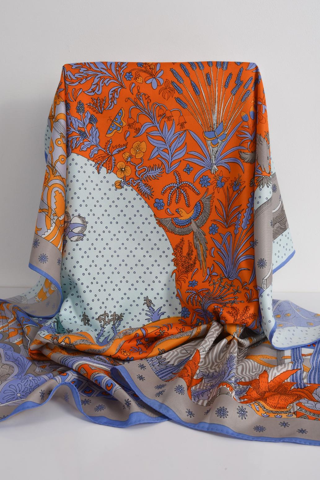 • dámský luxusní šátek značky PECA del SOL v energickém oranžovo-modrém ladění zaujme na první pohled hravým mixem vzorů, kde se prolínají jemné puntíky, květinové motivy i originální ilustrace inspirované přírodou a fantazií