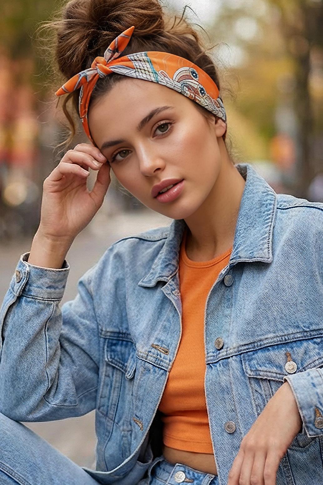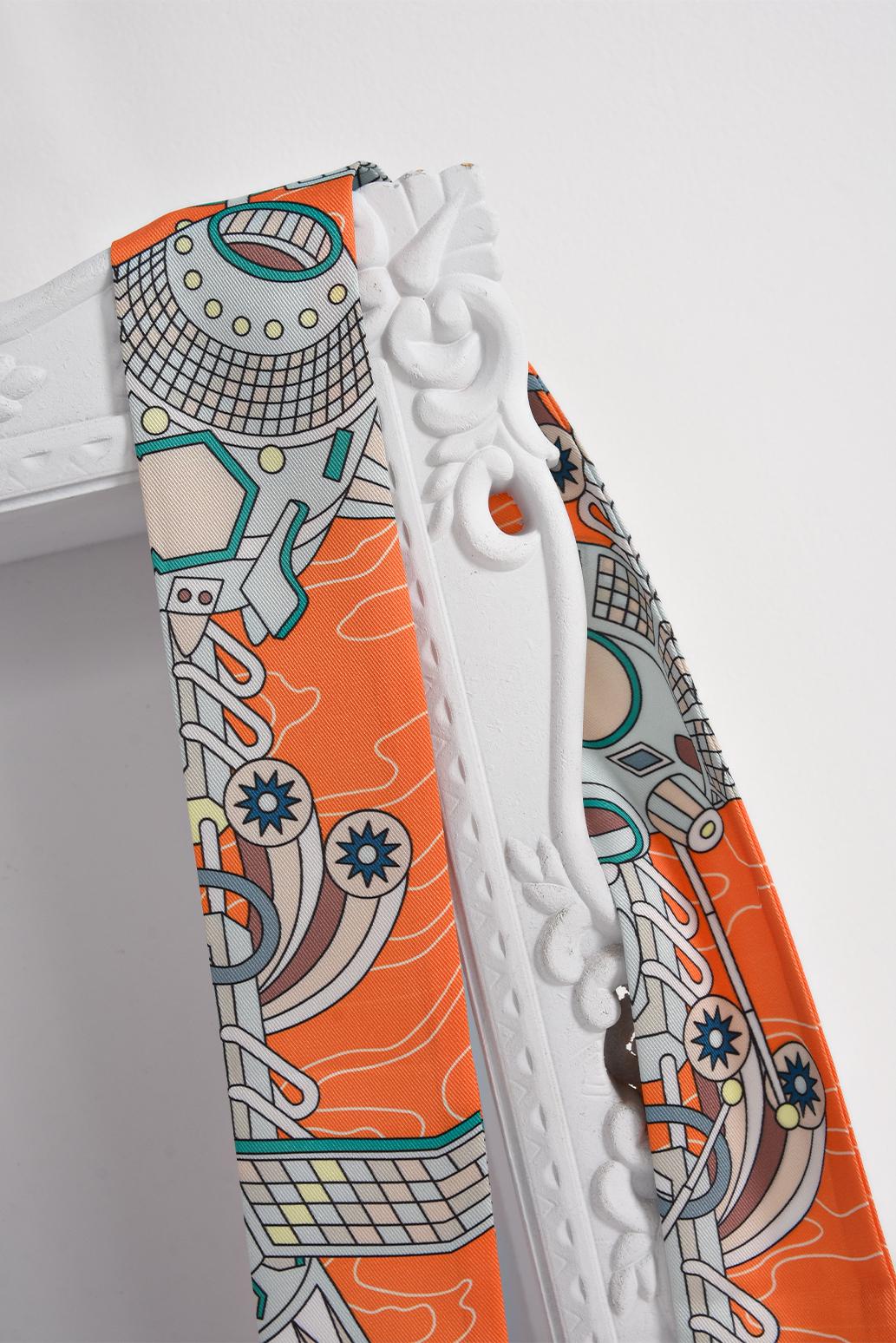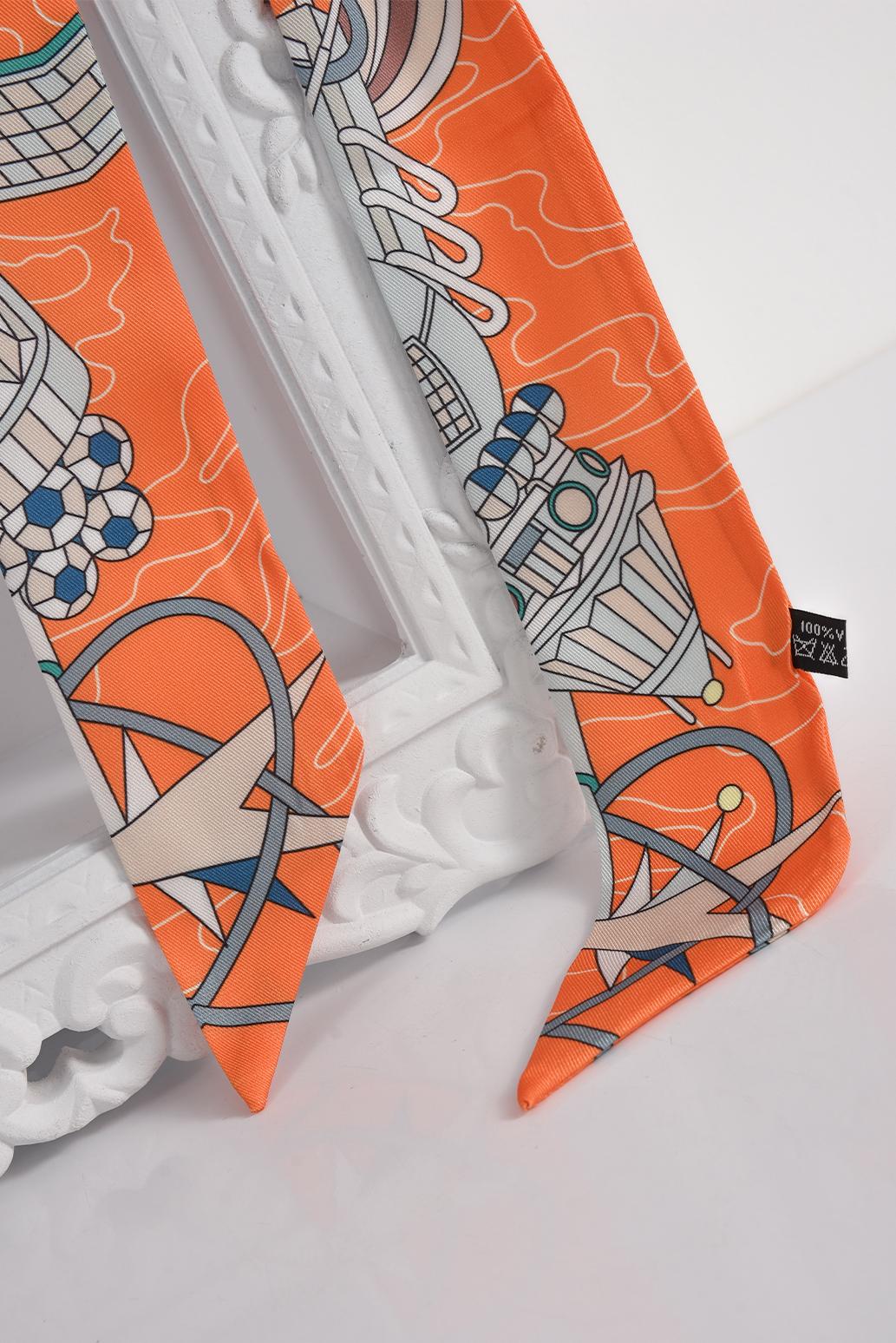 • dámský saténový šátek PECA del SOL v energickém oranžovém tónu rozproudí outfit hravou paletou barev s nápaditým motivem Orbit Chic, který zaujme na první pohled