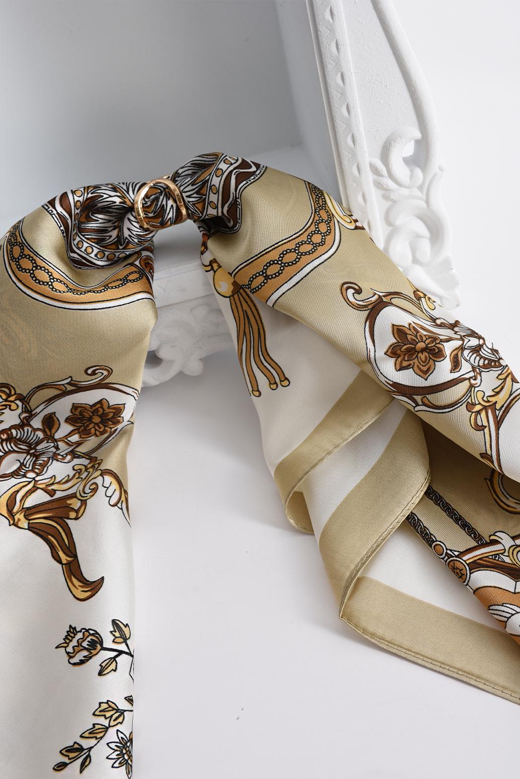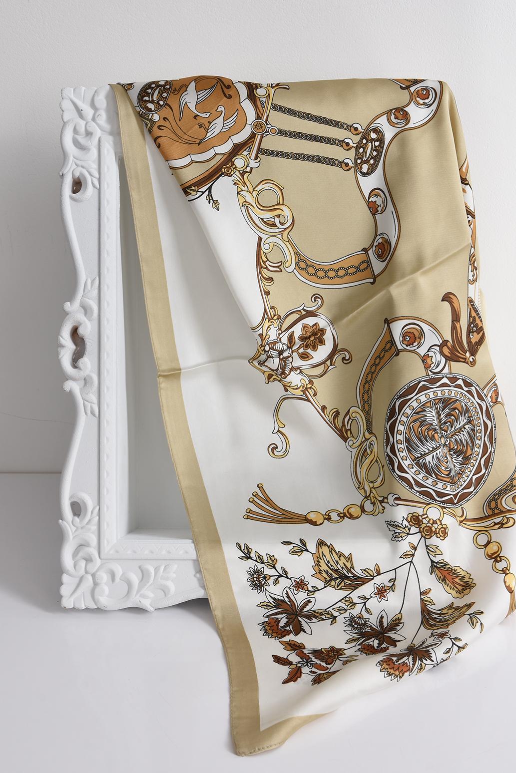 • dámský šátek na hlavu, na krk nebo třeba na kabelku oblíbené značky PECA del SOL v krémovo-béžové kombinaci Baroque Champagne zaujme ornamentálním vzorem inspirovaným řetízky, medailony a jemnými květinovými motivy, které spolu vytvářejí harmonický celek s nádechem elegance