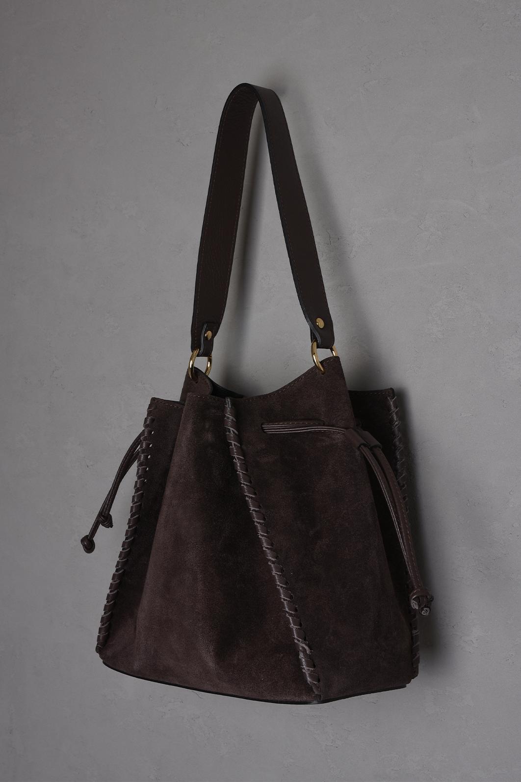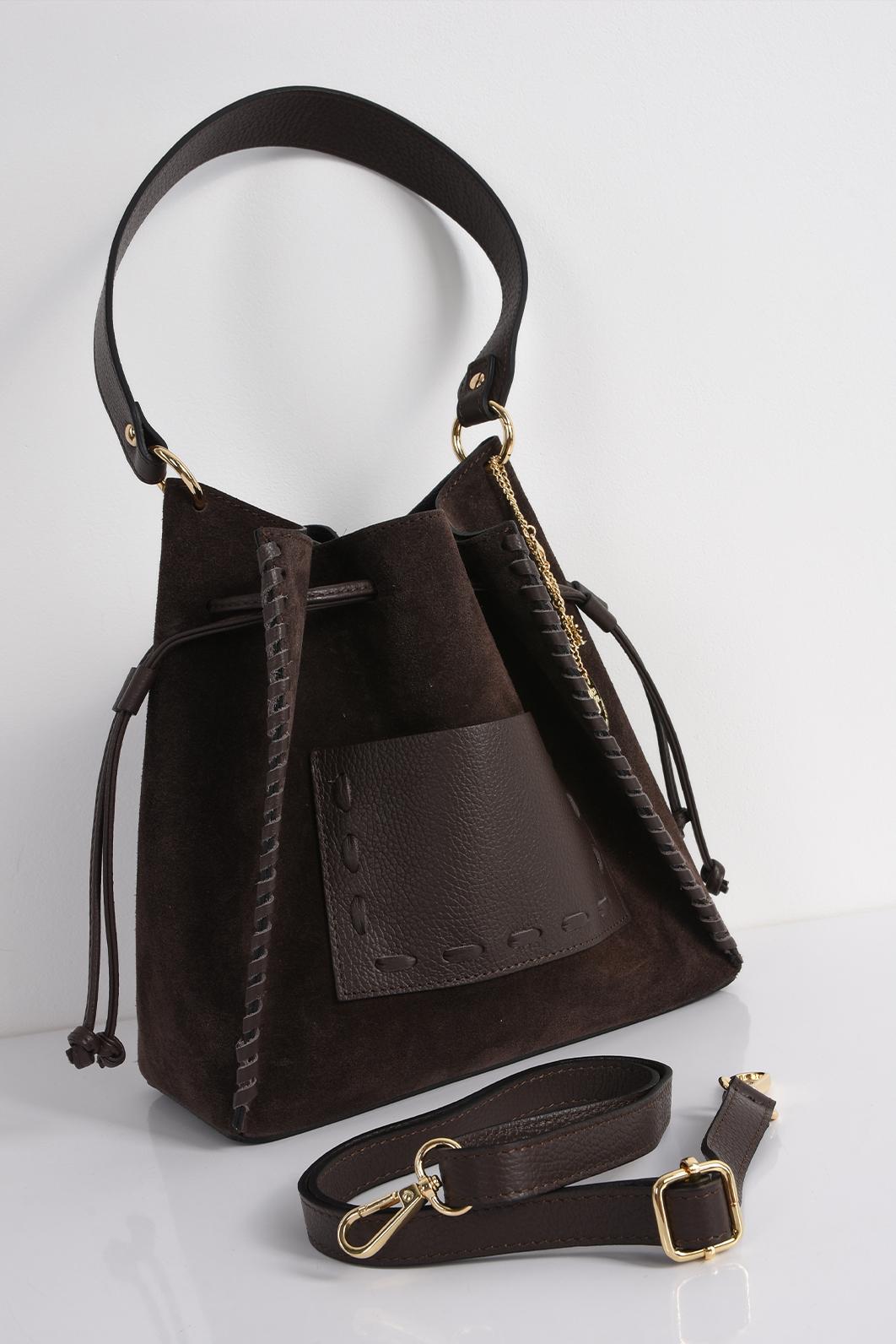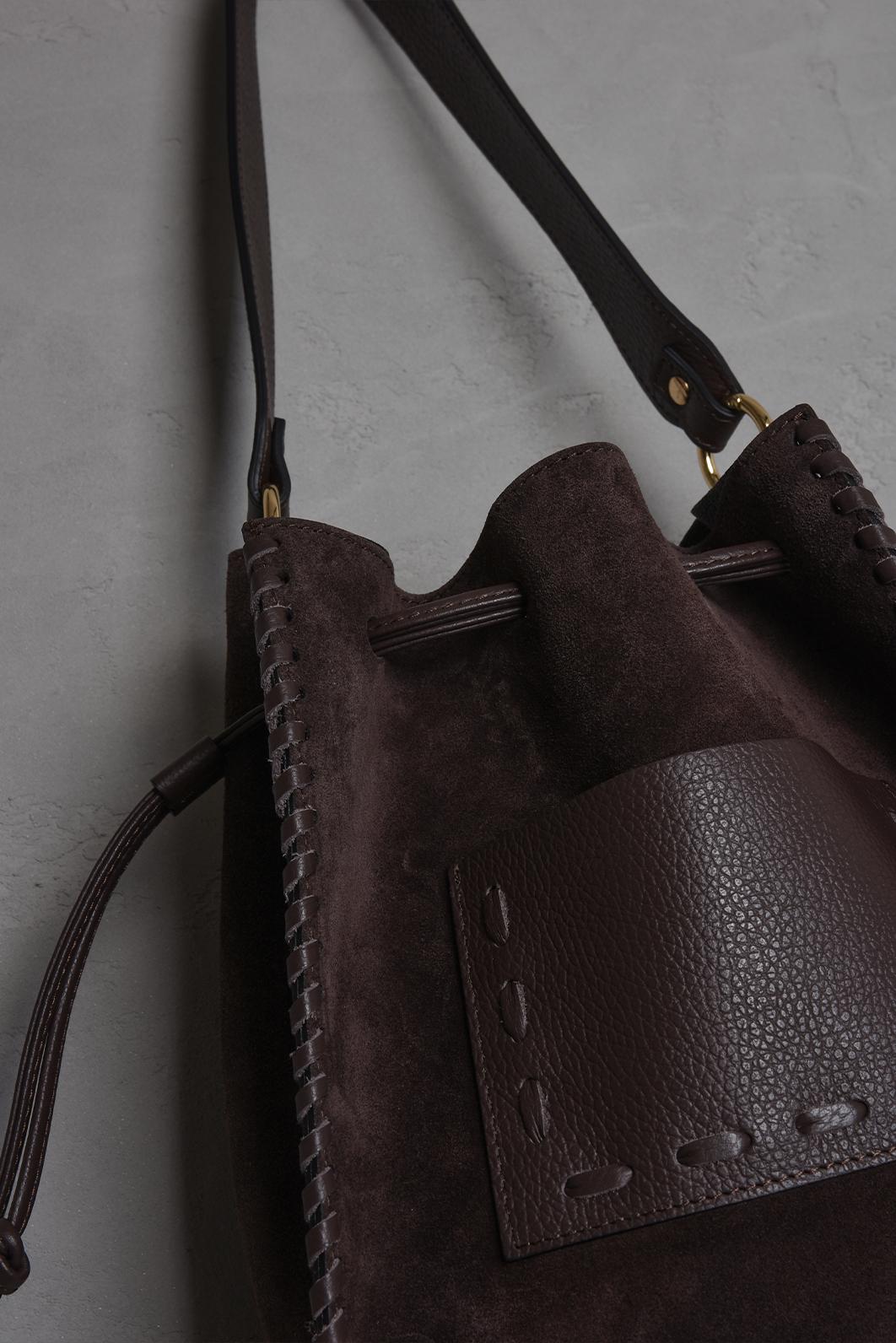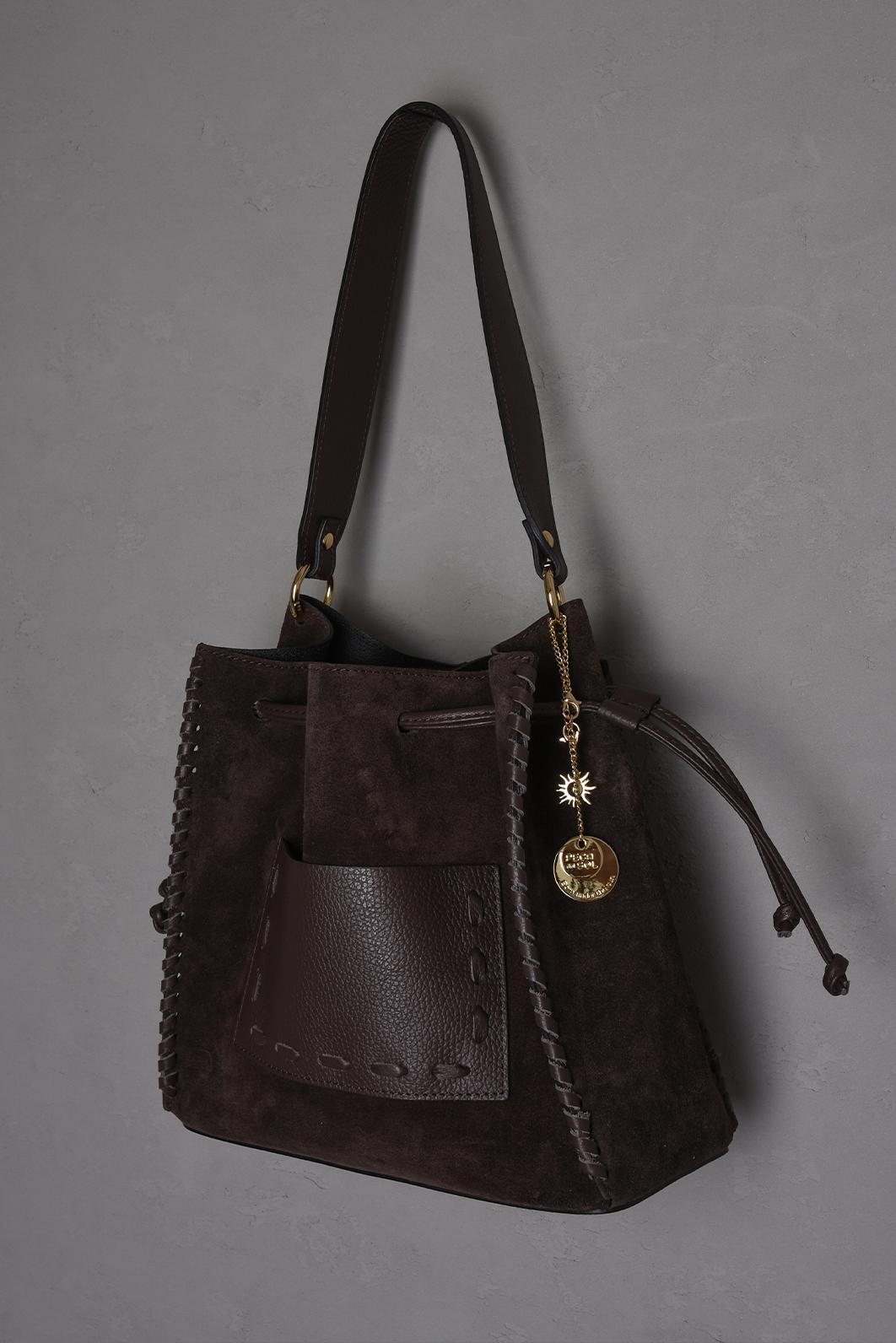 • hnědá kožená bucket bag kabelka PECA del SOL v hlubokém hnědém / čokoládovém tónu Dark Chocolate zaujme kombinací hladké kůže a semišového povrchu, který jí dává zajímavou texturu i výraznější charakter