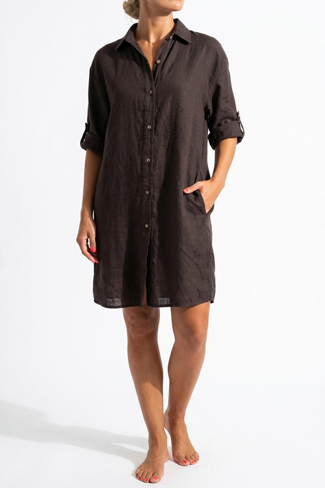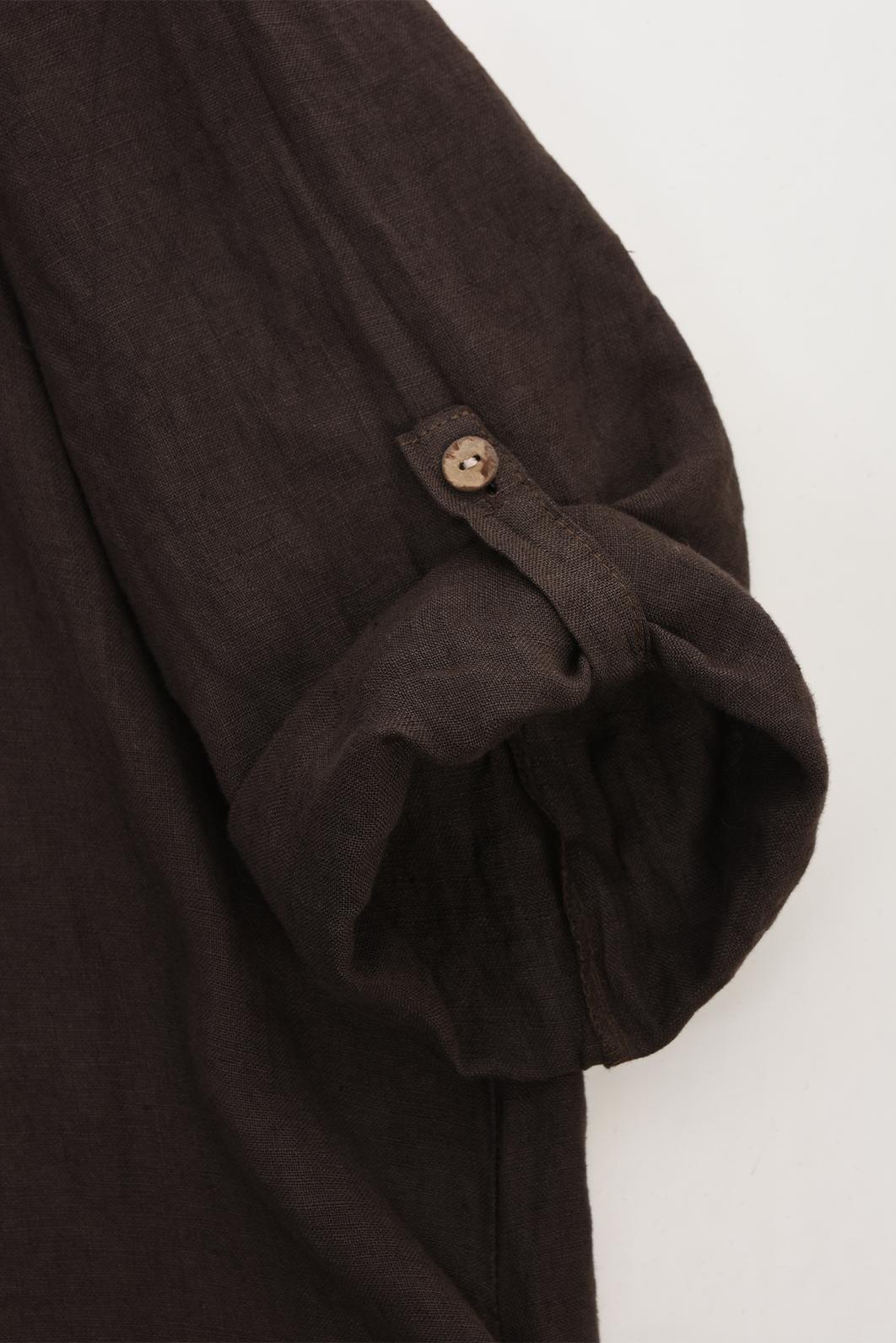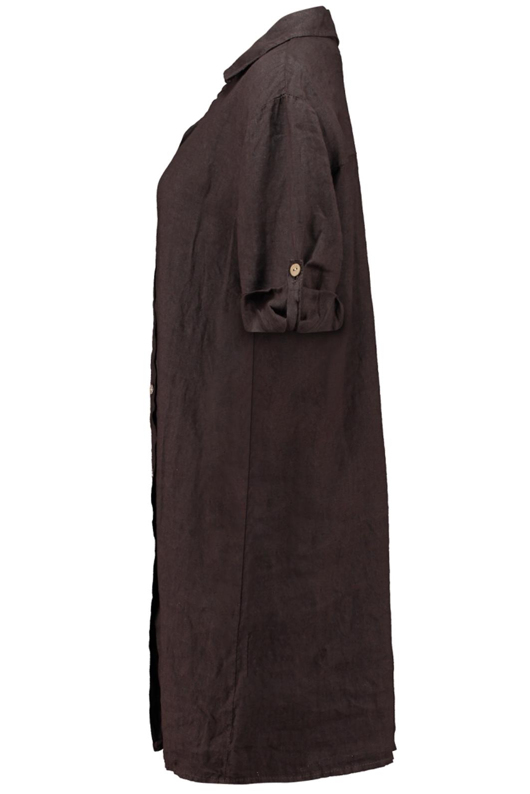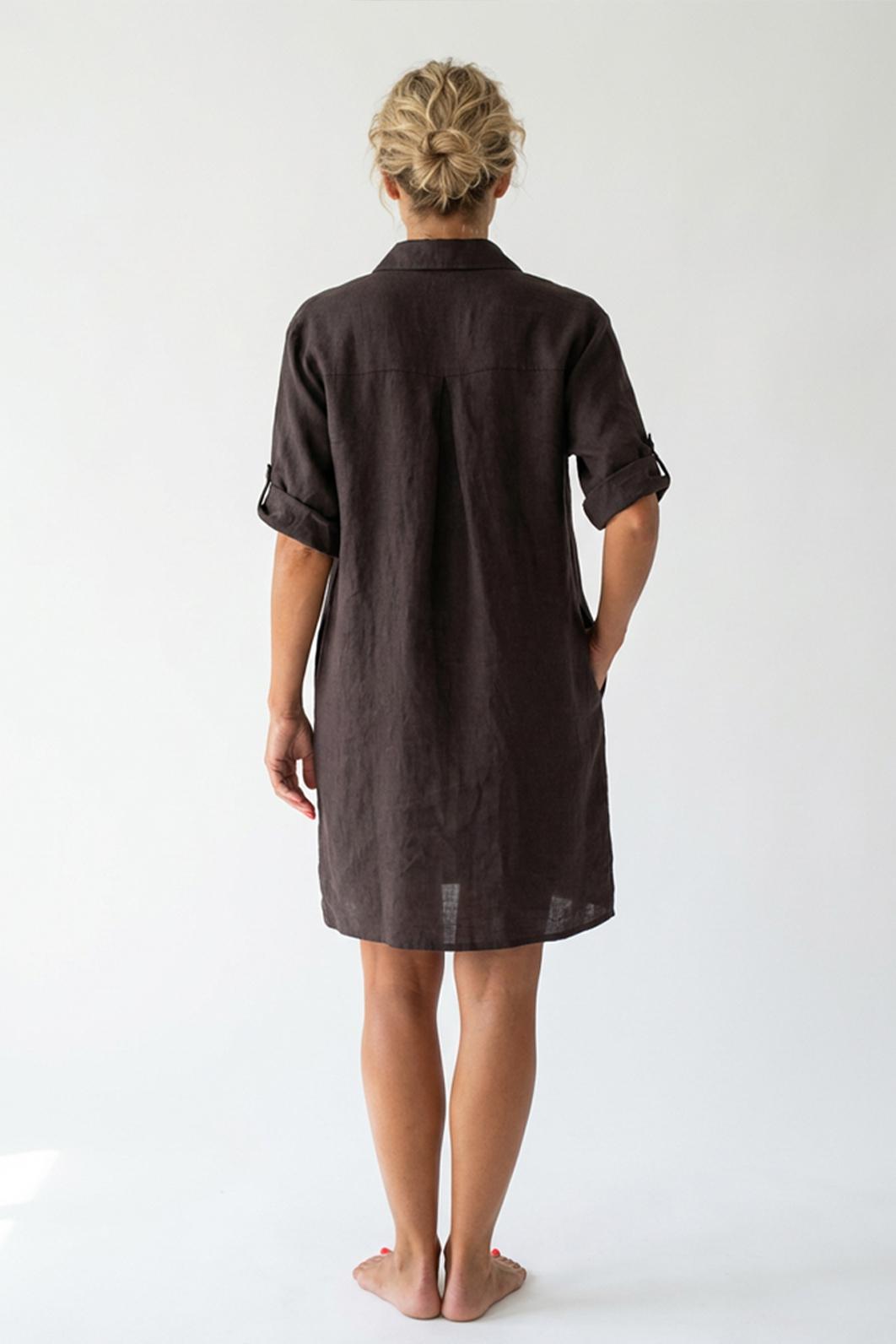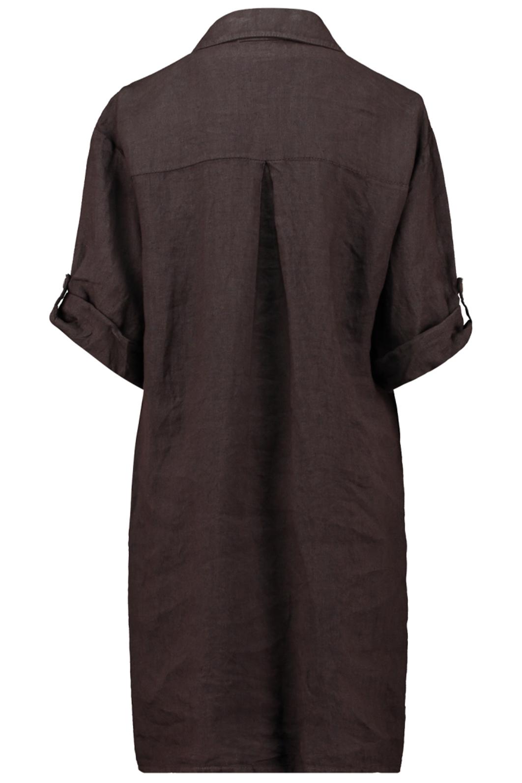 • dámské hnědé lněné šaty s kapsami Zabaione v hlubokém čokoládovém tónu jsou nadčasovou elegancí s jemně uvolněným nádechem