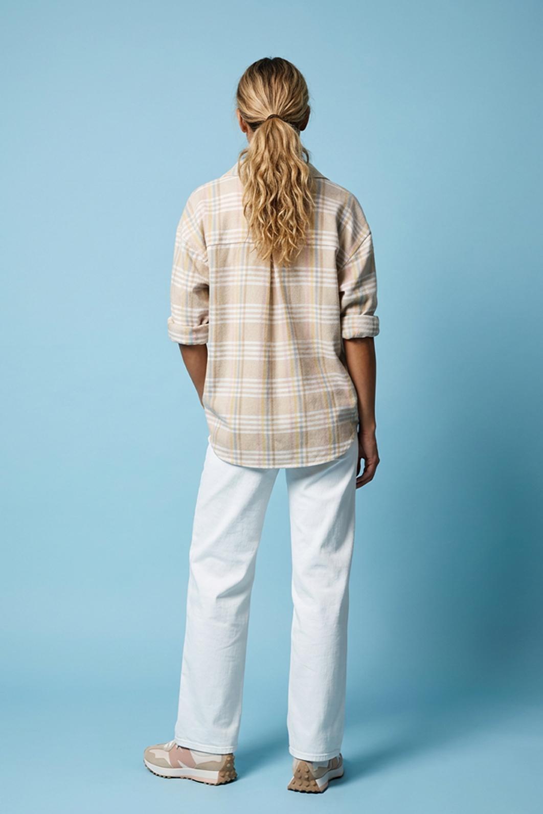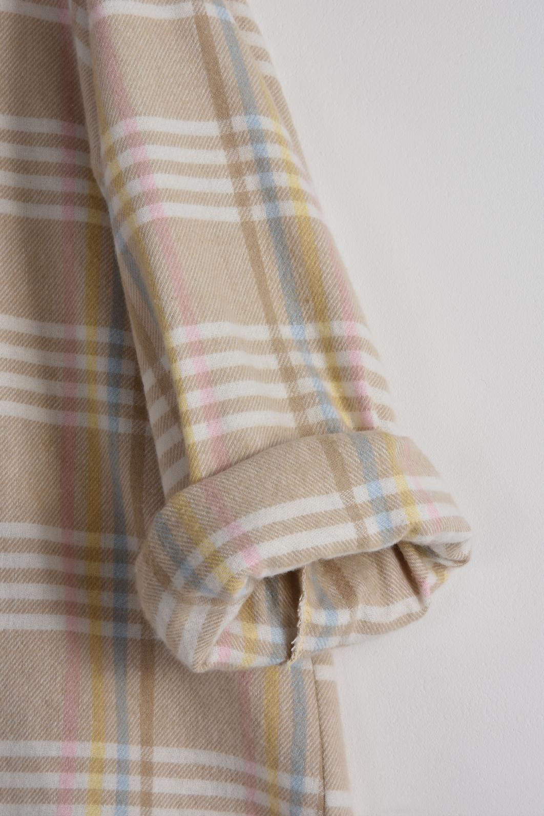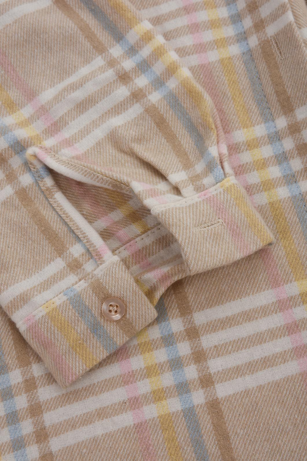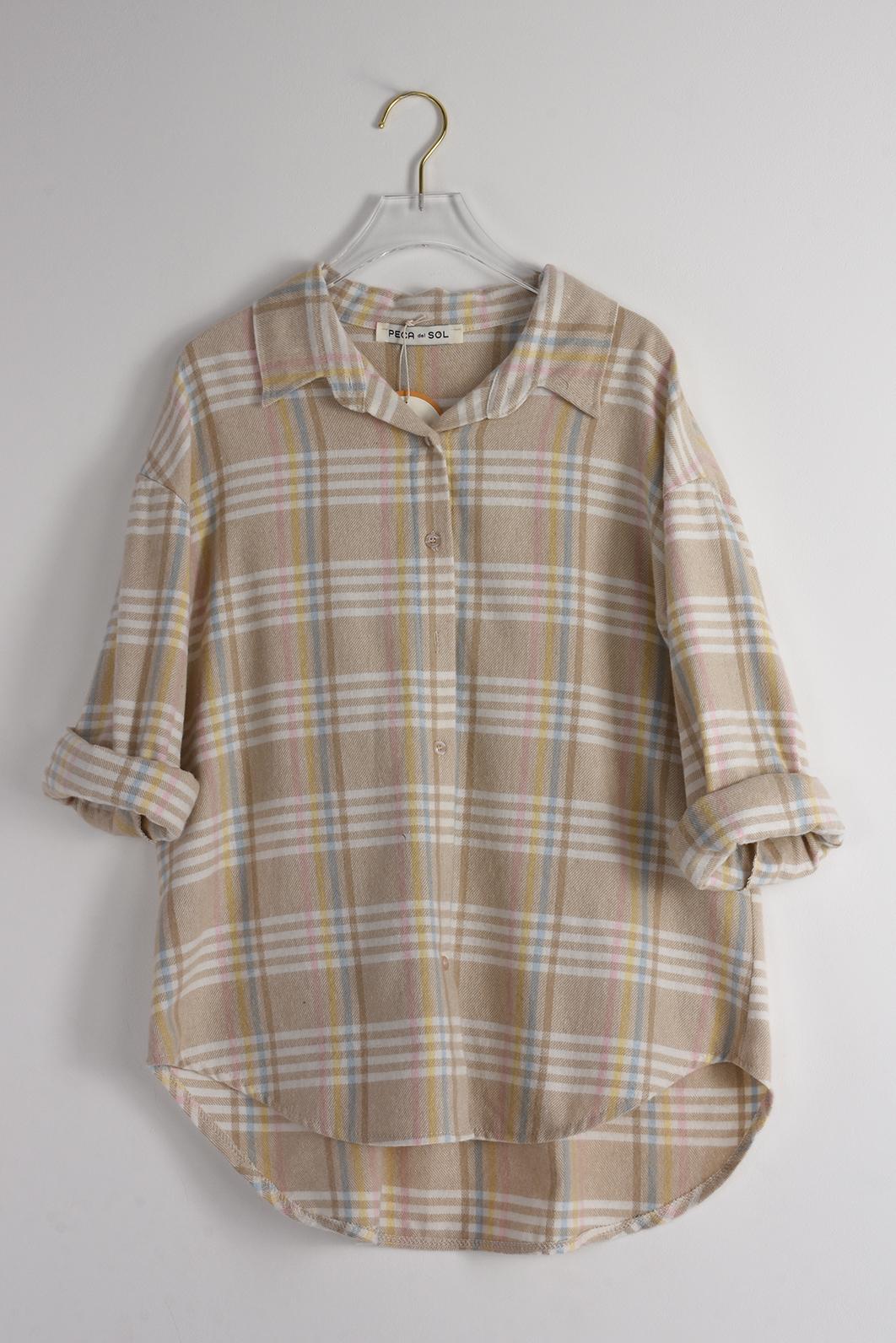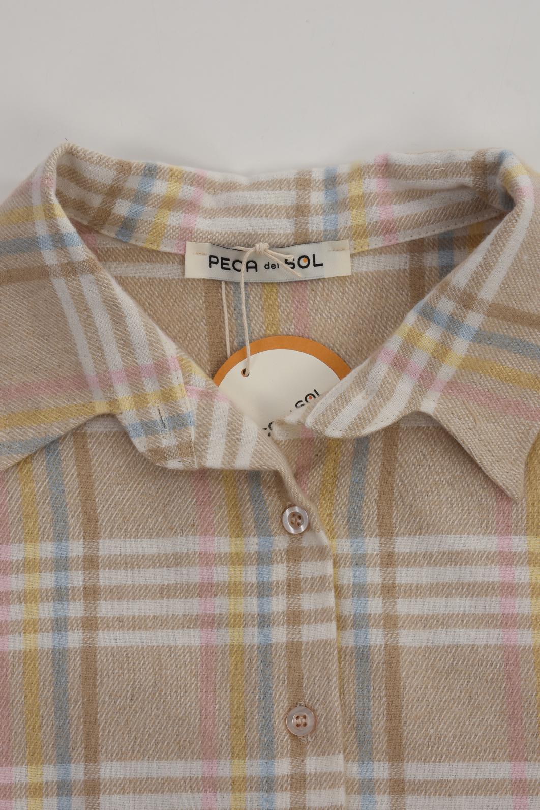 • chic kostkovaná košile dámská oblíbené značky PECA del SOL v jemných béžových tónech s pastelovými linkami připomíná klidné ráno s kávou a lehkým sluncem za oknem