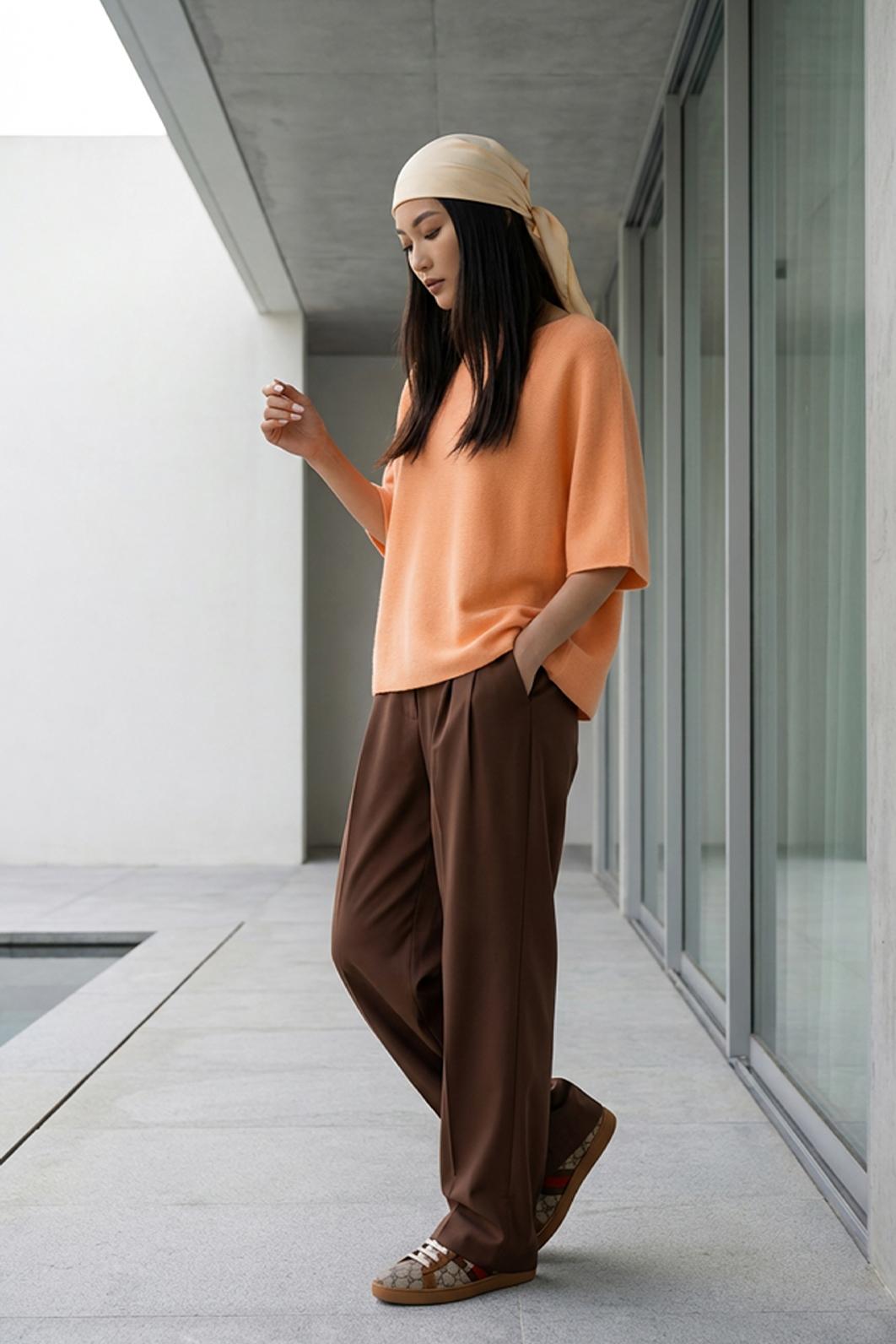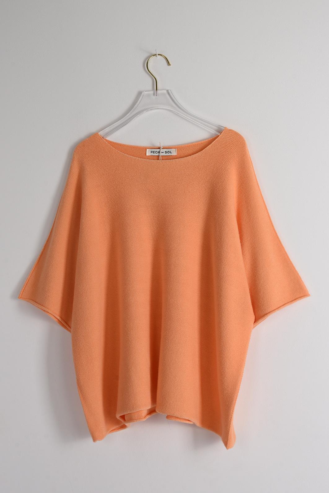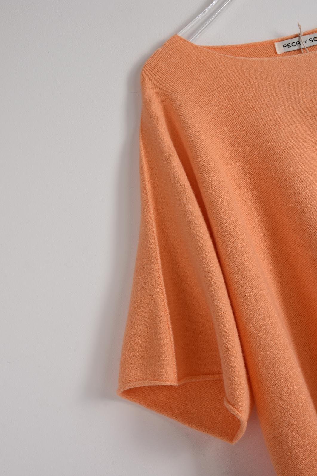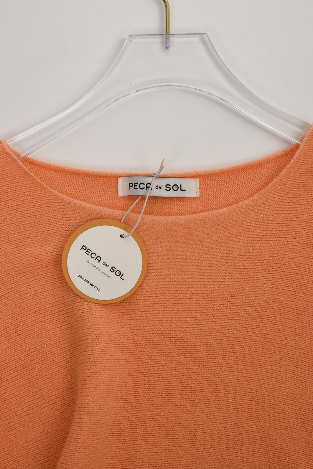• jemně meruňkově oranžový dámský svetřík s krátkým rukávem od oblíbené značky PECA del SOL v šik apricot odstínu rozzáří celý tvůj outfit