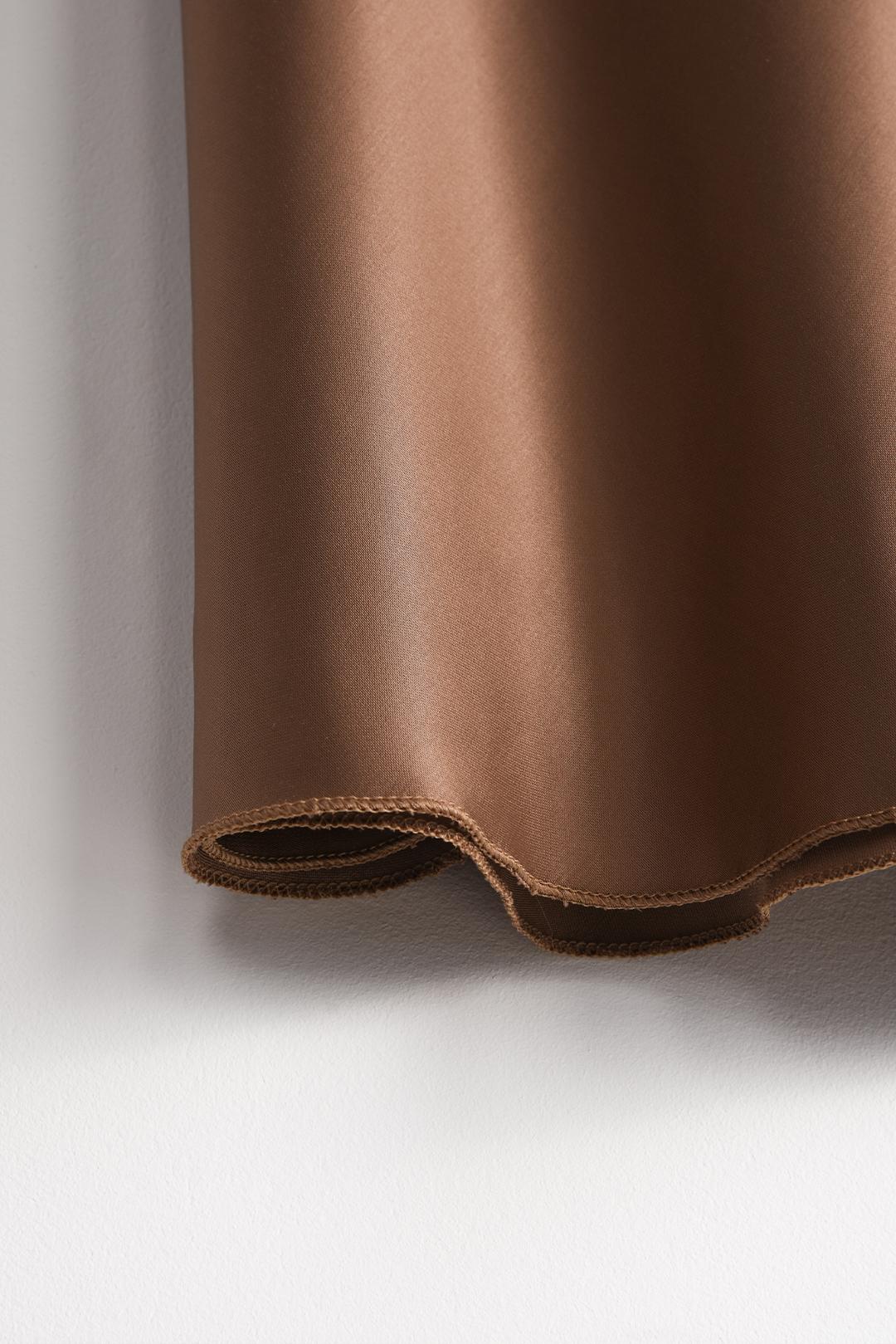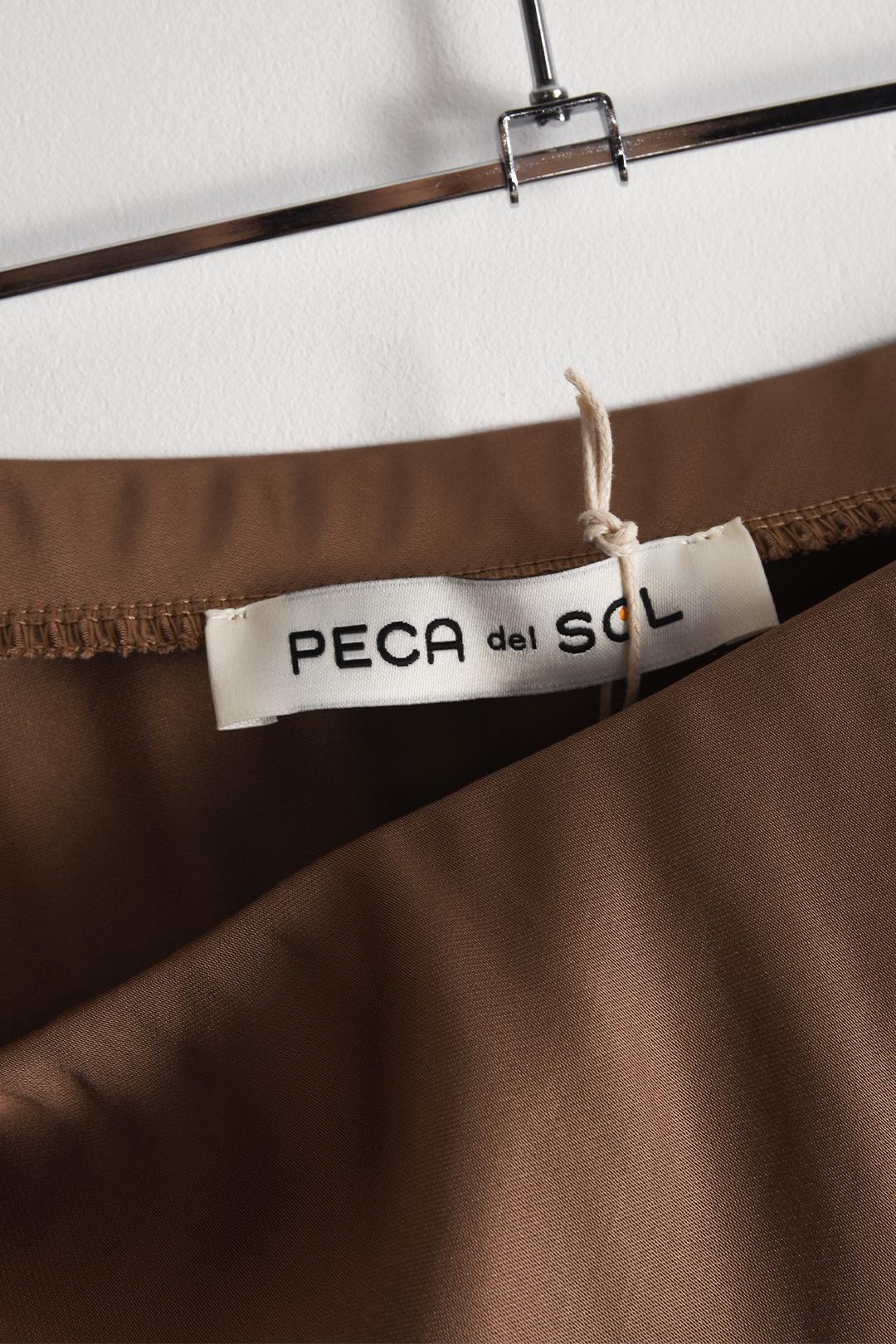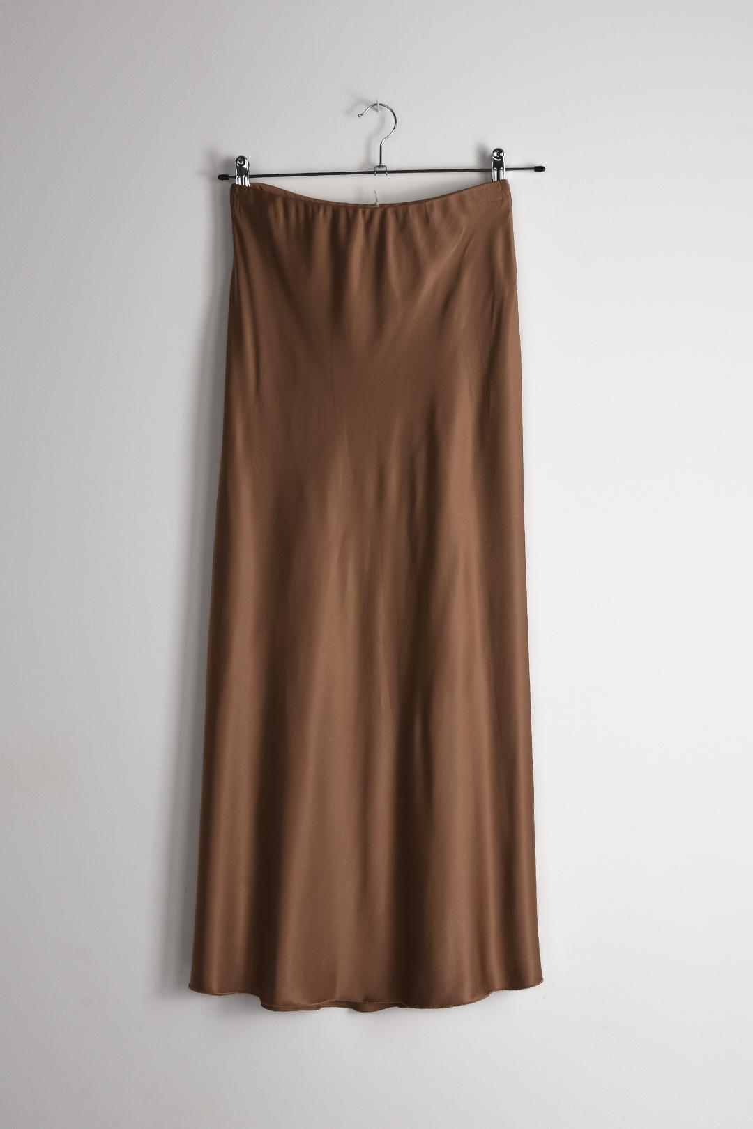 • saténová dlouhá sukně PECA del SOL v hnědém tónu je jako jemně tekoucí látka, co se s každým krokem elegantně pohybuje a podtrhuje linii postavy