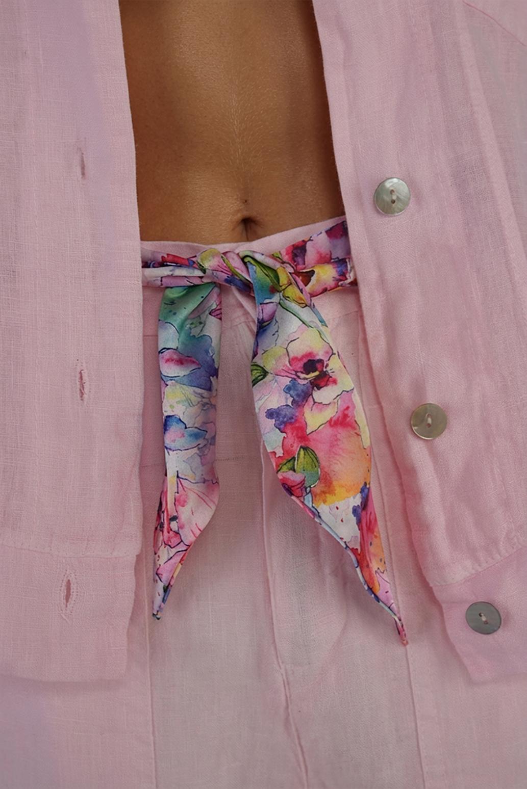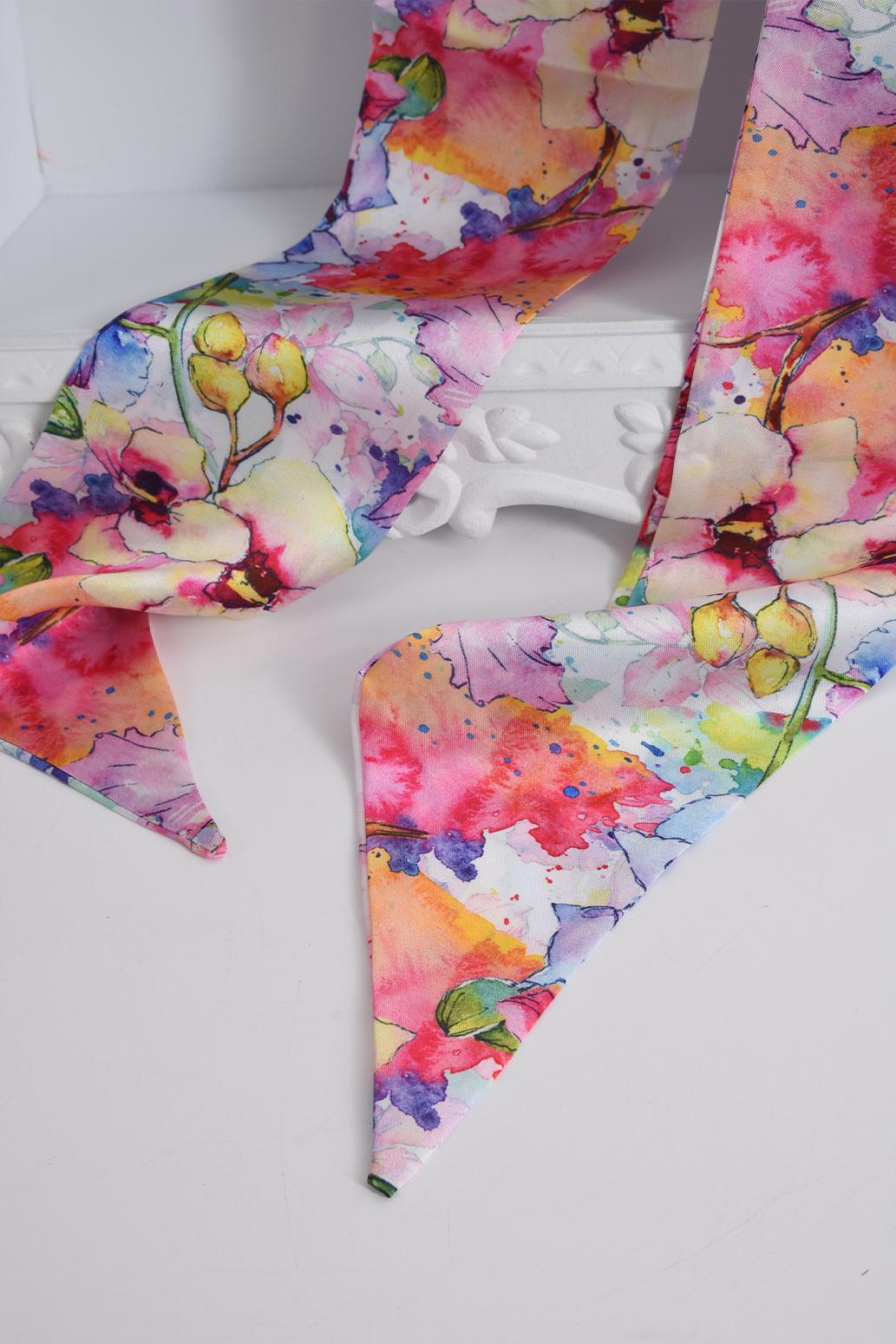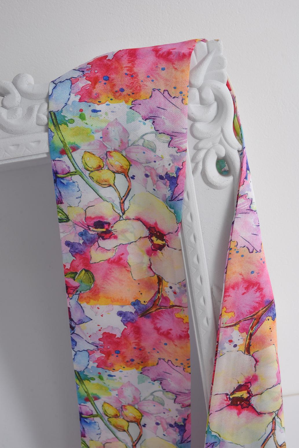 • dámský květinový šátek z hedvábí a viskózy PECA del SOL v akvarelovém mixu barev rozzáří outfit a vnese do něj hravost i jemnou ženskost