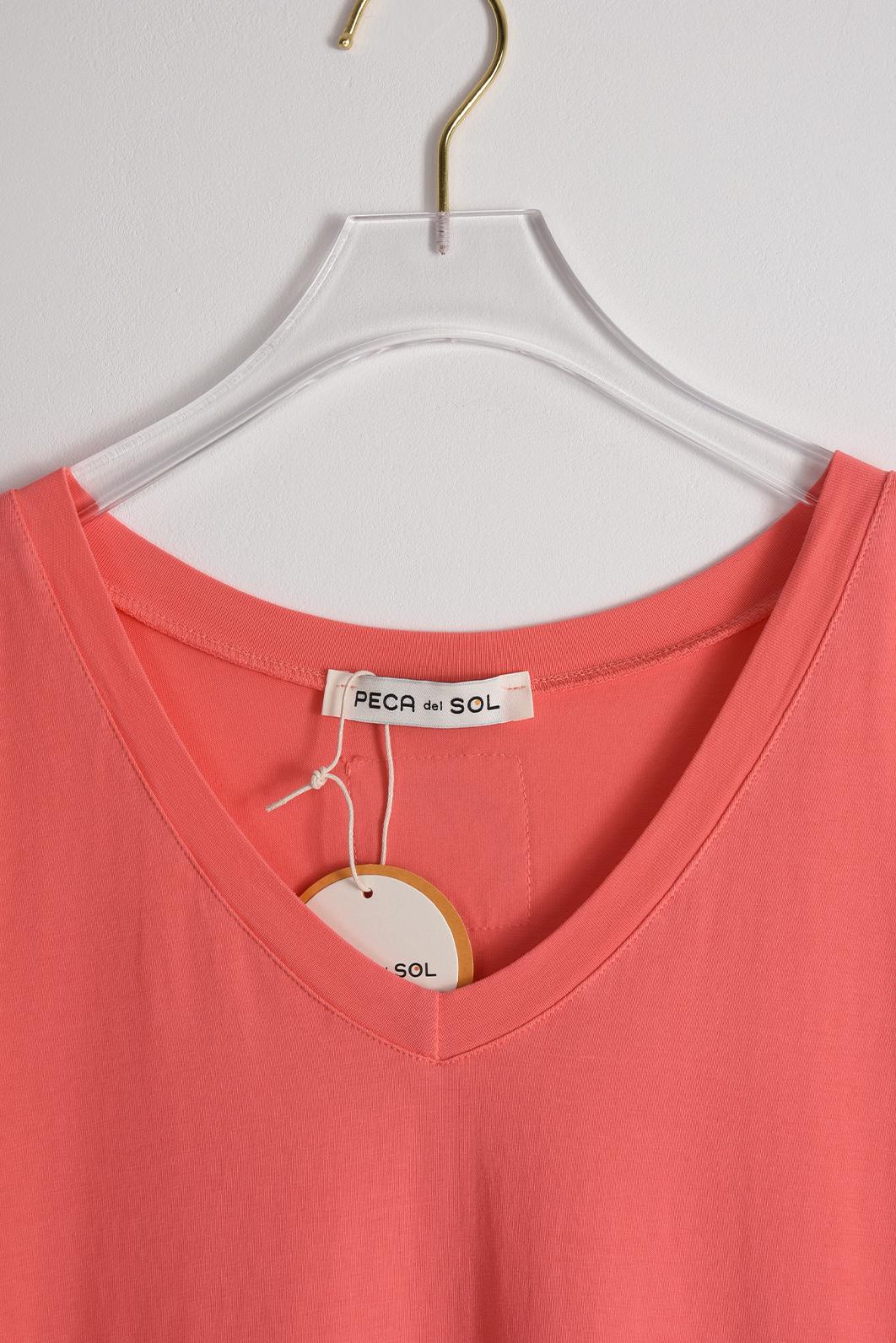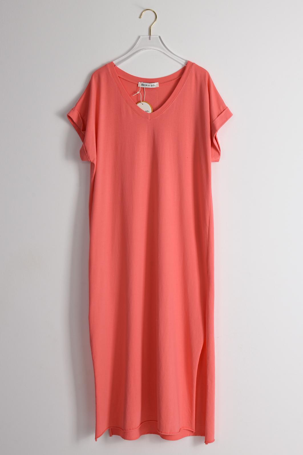 • korálové dlouhé šaty s rozparkem a krátkým rukávem oblíbené značky PECA del SOL v krásném coral odstínu rozzáří letní šatník a přinesou svěží energii slunečných dní