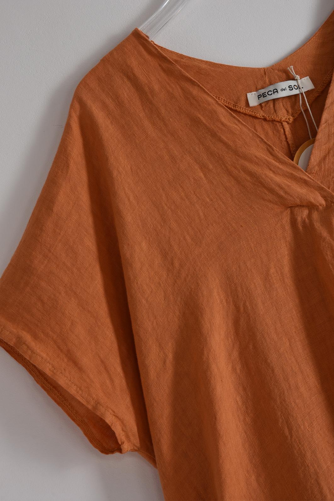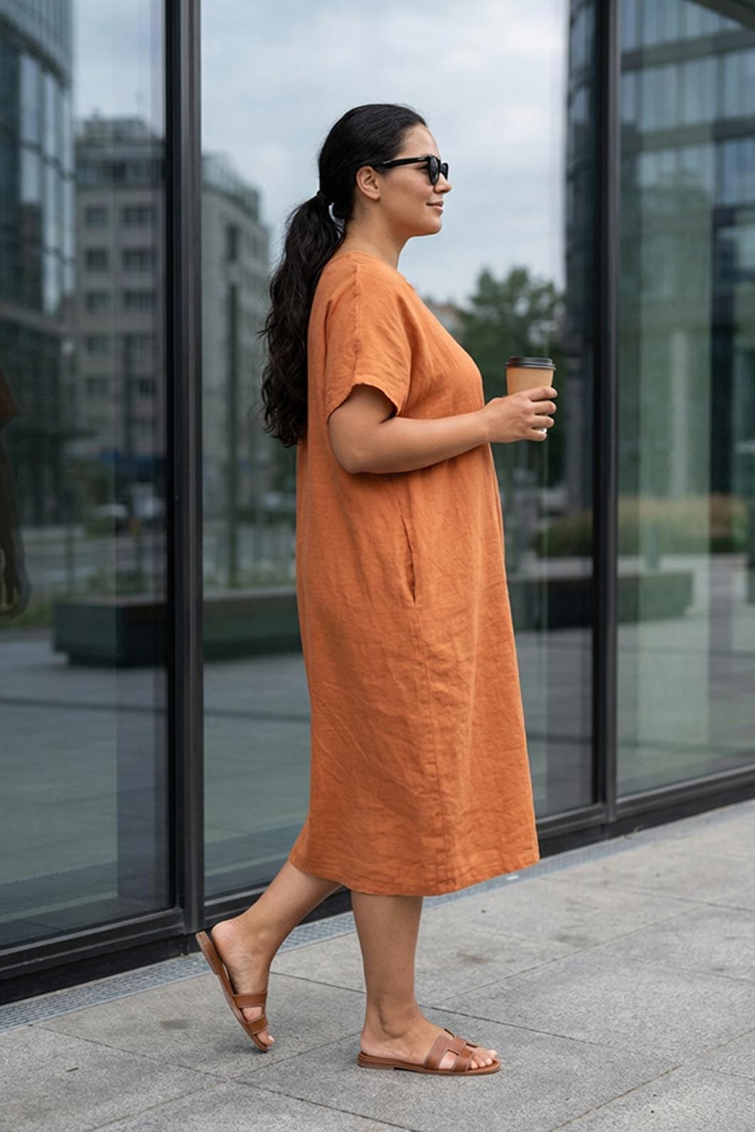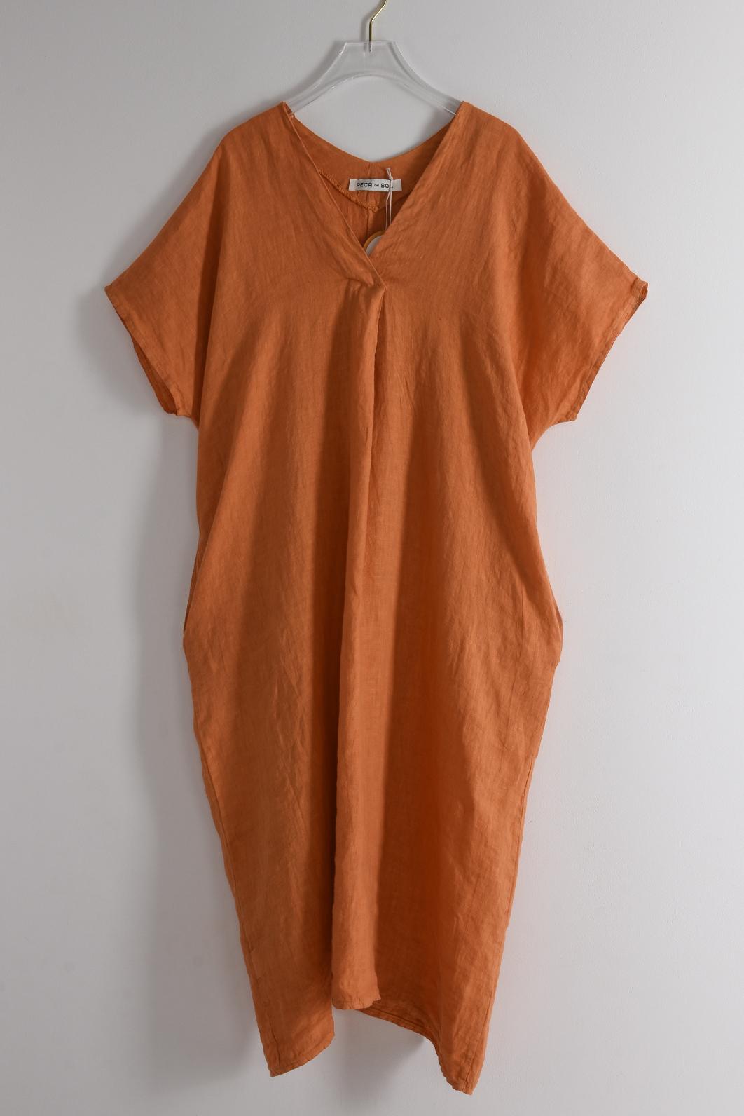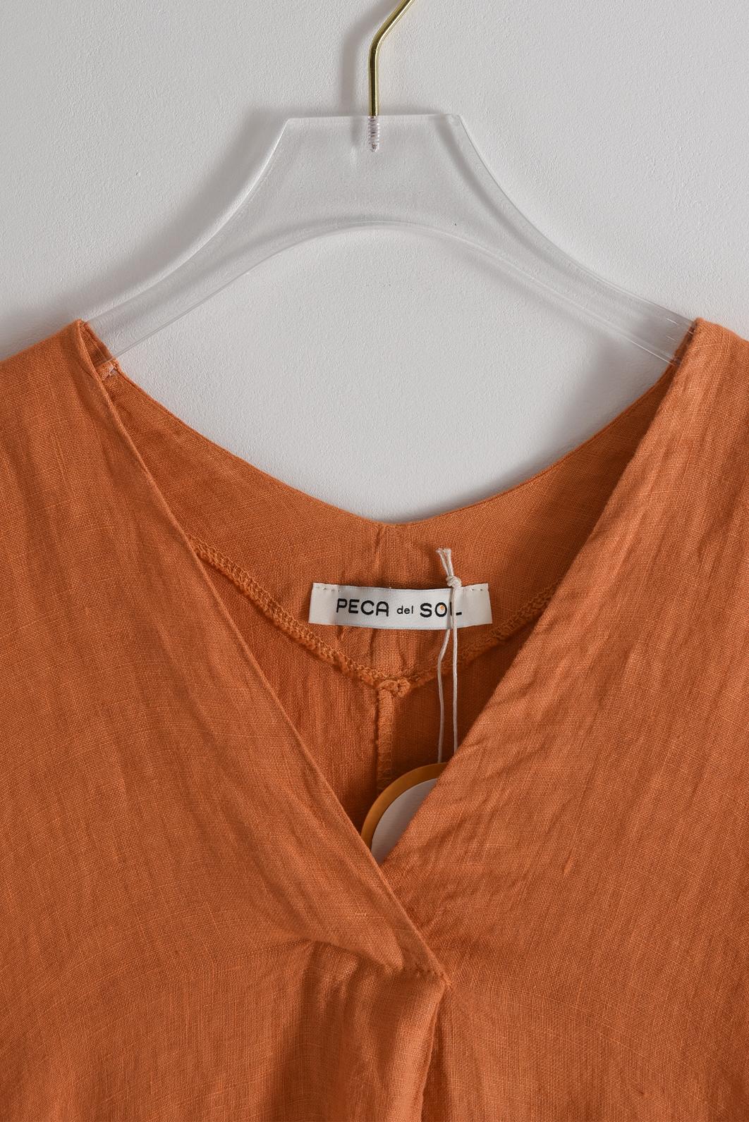 • letní lněné maxi šaty PECA del SOL v zemité terakotově oranžové evokují zapadající slunce a okamžitě rozzáří letní šatník
