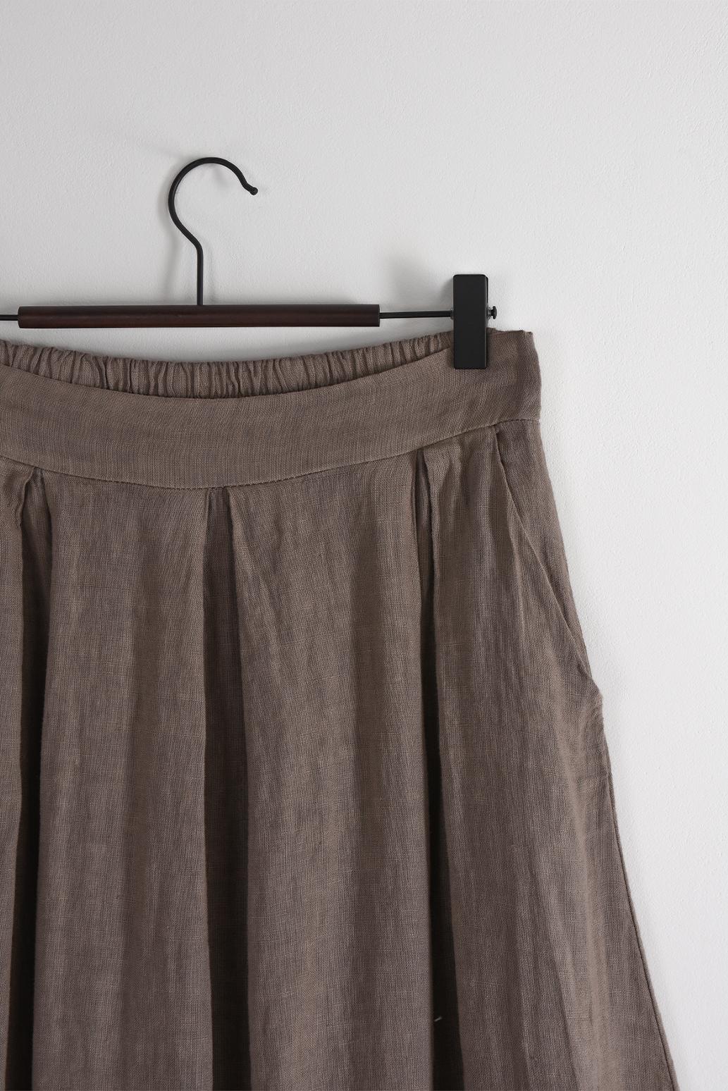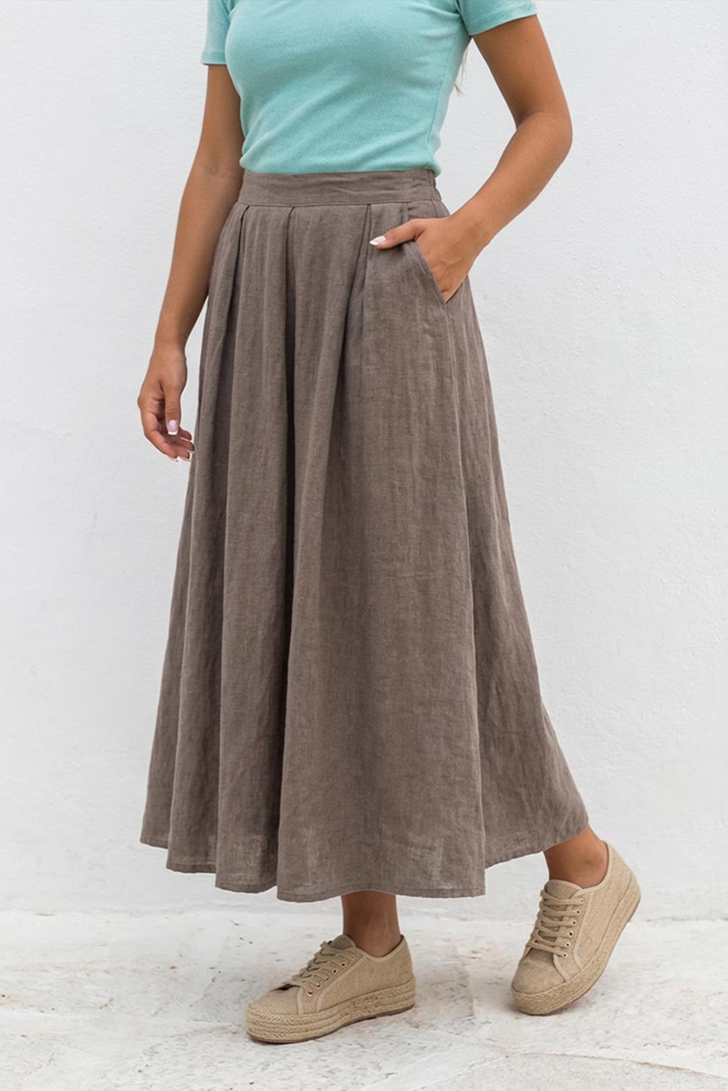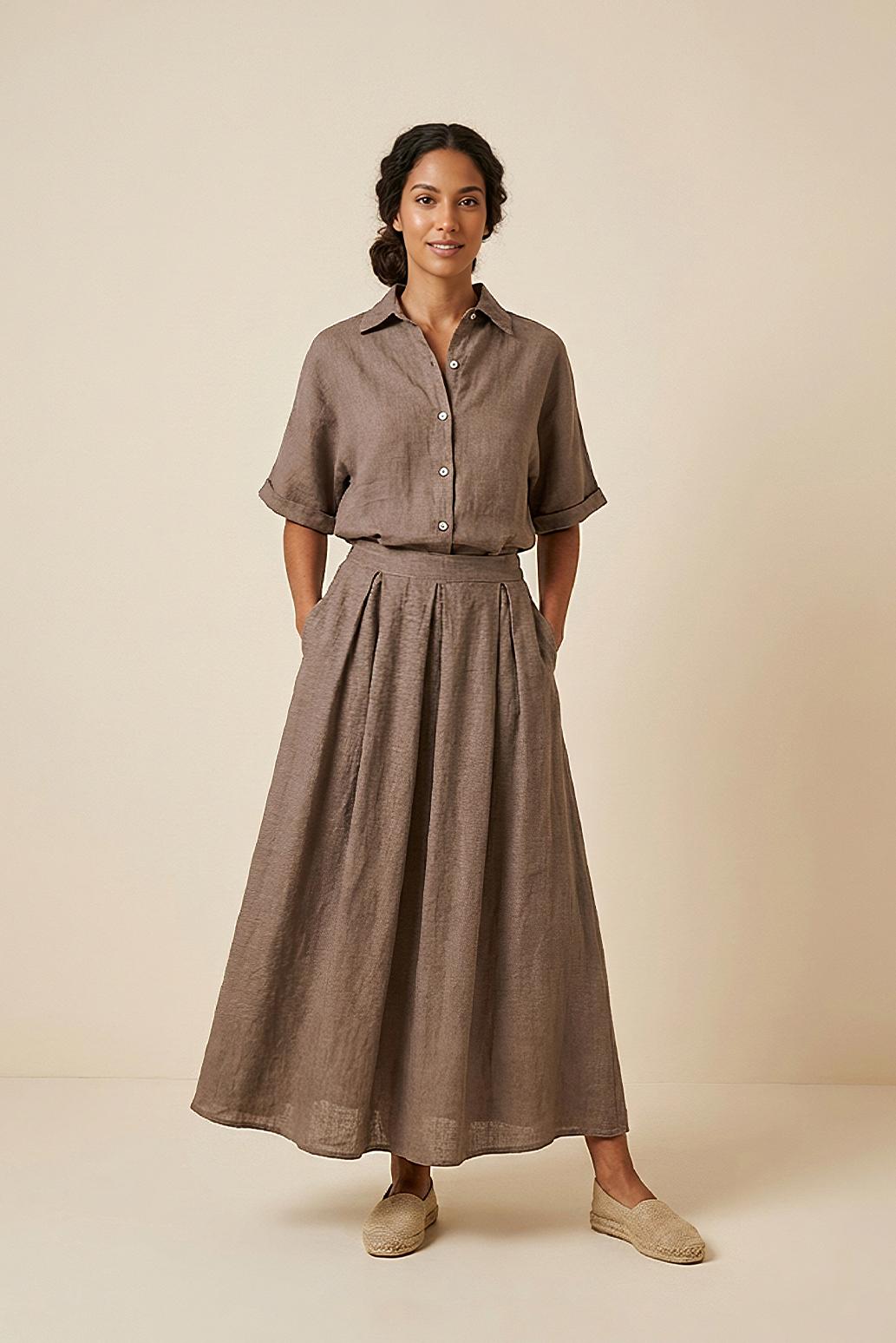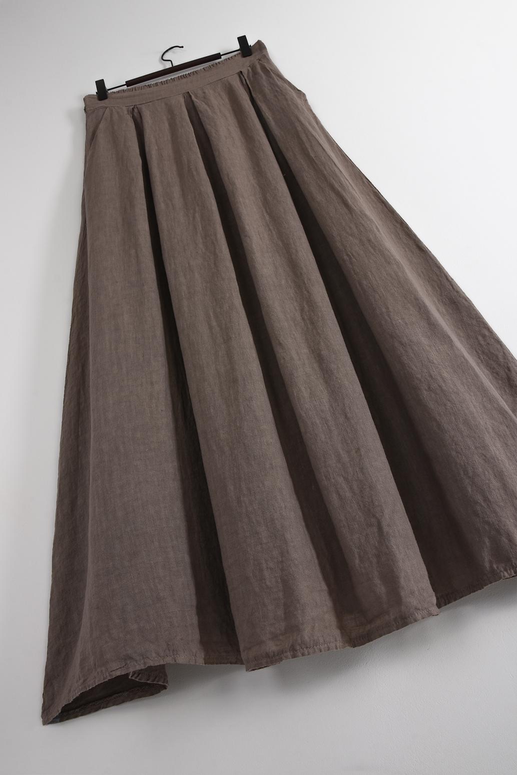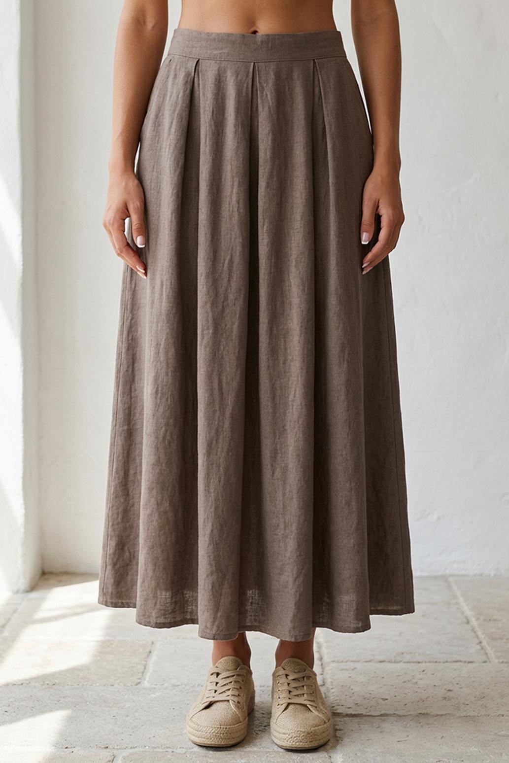 • dlouhá lněná sukně s kapsami PECA del SOL v tlumeném taupe odstínu připomíná letní klid a lehkost, která krásně ladí s minimalistickým šatníkem