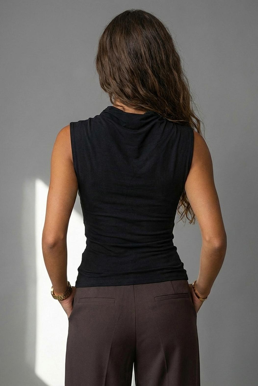 • černý top bez rukávů drapovaný od značky Pieces je tichý společník pro dny, kdy chcete vypadat sebejistě, ale bez zbytečné okázalosti