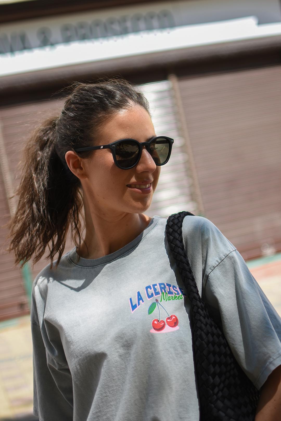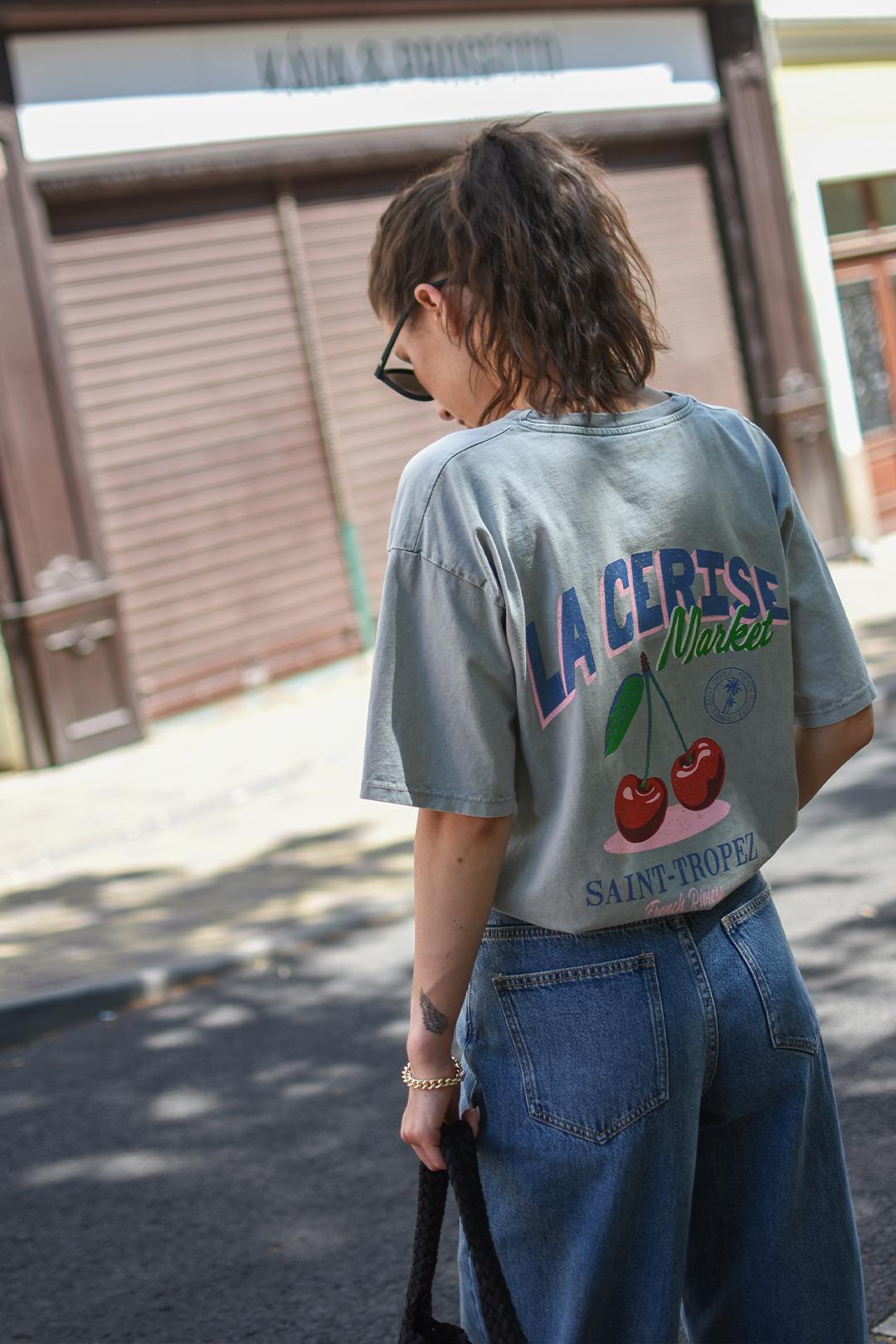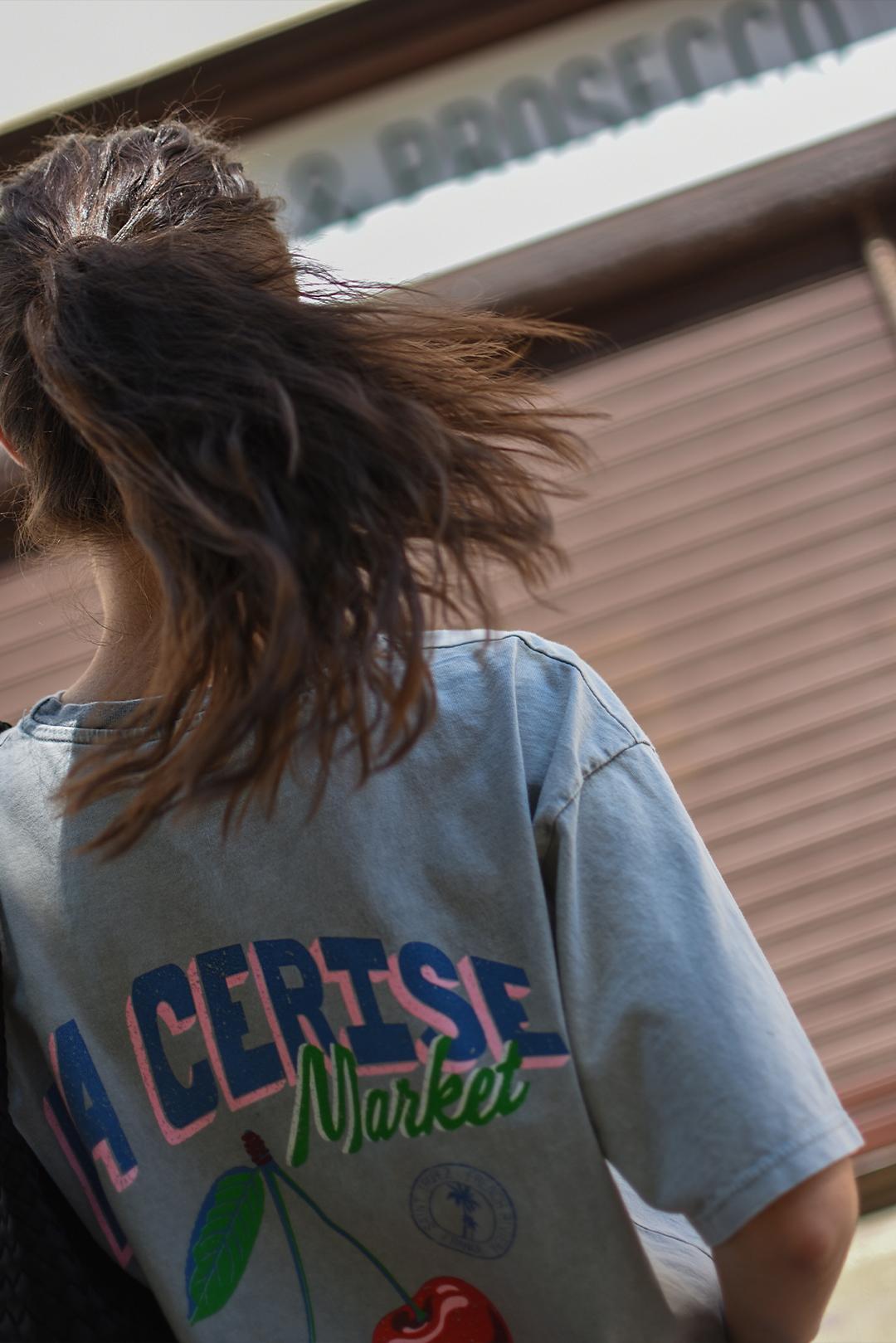 • dámské šedé tričko s třešněmi s výraznou letní grafikou s retro nádechem: nápis La Cerise Market – Saint-Tropez